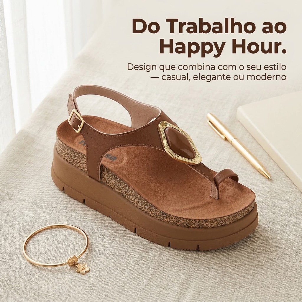 Elegante e cheia de personalidade, esta sandália plataforma une conforto e sofisticação em um design moderno. A tira com separador dos dedos oferece sustentação e estilo, enquanto a pedra se destaca como o ponto alto do visual, conferindo um ar sofisticado ao calçado. O fechamento traseiro com tira regulável garante ajuste perfeito ao tornozelo para diferentes tipos de pé. A plataforma eleva a silhueta com estabilidade, e a palmilha acolchoada em camurça assegura conforto durante o uso prolongado. Perfeita para compor looks casuais ou mais elaborados, do dia à noite. Ficha Técnica: Marca: Moleca Referência: 5513.110 Material Externo: Napa Sintética com Aplicação Material Interno: Napa Sintética Fechamento: Fivela Ajustável Solado: Borracha TR (Antiderrapante) Altura do Salto: 4 cm Material de Qualidade: Confeccionada em napa premium, oferecendo durabilidade e um toque suave na pele. Detalhe Sofisticado: Aplicação de pedra central com contorno metalizado, proporcionando um ponto de luz e requinte ao calçado. Interior Acolchoado: Palmilha anatômica com toque aveludado, desenhada para absorver impactos e massagear os pés. Solado Antiderrapante: Sola flatform tratorada em borracha TR, garantindo segurança, aderência e modernidade em cada passo. Fechamento Seguro: Tira traseira com fechamento em fivela ajustável, permitindo o ajuste perfeito ao tornozelo. Versatilidade: Ideal para compor looks que pedem atitude, como vestidos fluidos, calças pantacourt ou saias midi.