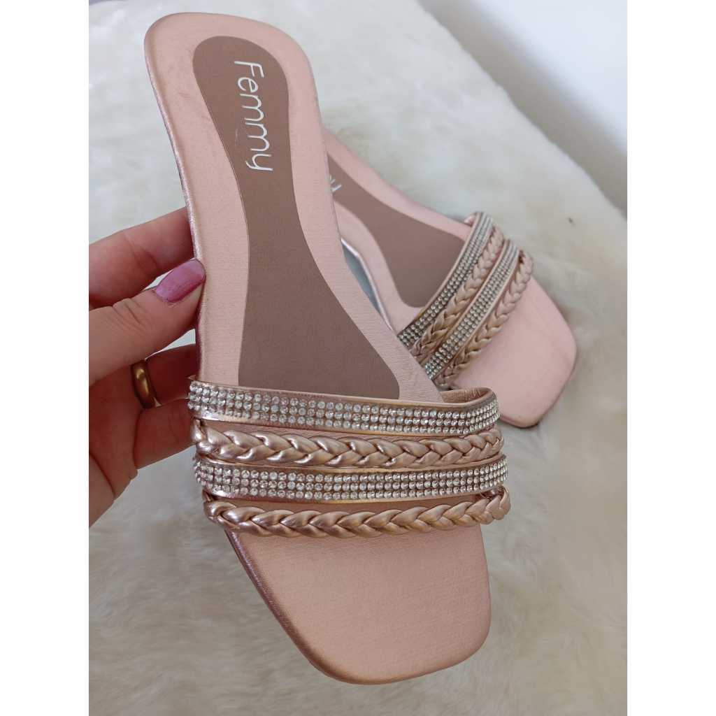 Sandália rasteira 4 Tiras Strass Trança confortável antiderrapante Rasteirinhas Femmy 01