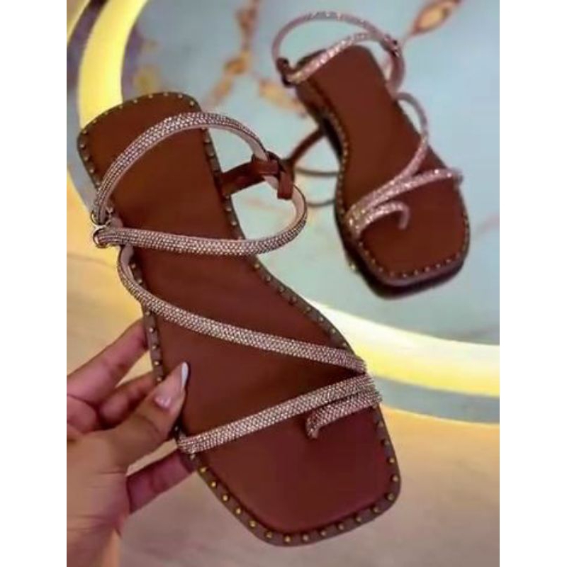 Sandália Rasteira Cravejada Quadrada Super Confortável de Strass Colorido