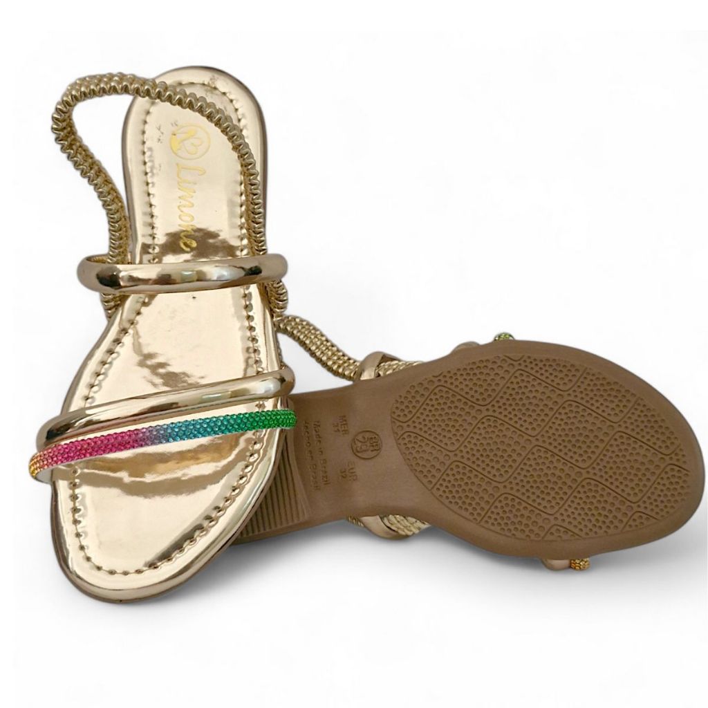 Sandália Rasteira Feminina Infantil Traseiro de Elástico com tiras de Strass Brilho Colorida Traseiro de Elástico ajusta conforme o pé! Sandália com Brilho é indicado para qualquer evento e também para o dia a dia. Lindo, mega confortável, charmoso e delicado! Ideal para quem buscar agilidade e praticidade. Disponível nos tamanhos: 20 ao 40 Acompanhar tabela de medidas 20 --- 14,0 cm 21 --- 14,5 cm 22 --- 15,5 cm 23 --- 16,0 cm 24 --- 16,6 cm 25 -- 17,2 cm 26 -- 18,0 cm 27 -- 18,3 cm 28 -- 18,7 cm 29 -- 19,0 cm 30 -- 20,0 cm 31 -- 20,7 cm 32 -- 21,5 cm 33 -- 22,0 cm 34 --- 23,5 cm 35 --- 24 cm 36 --- 25 cm 37 --- 25,7 cm 38 --- 26,2 cm 39 --- 27 cm 40 --- 28,7 cm ======================================================================= CONSERVAÇÃO: * Para conservar o seu modelo novo e bonito por muito mais tempo é fundamental seguir algumas recomendações: - A limpeza deve ser feita com sabão neutro e pano úmido e não deve ficar de molho. Não usar nenhuma fonte de calor para secar. Guardar em local sem umidade. - Não utilize Máquina de lavar e secar. - Independente do material do seu sapato, não esfregue com força ou passe esponjas grossas. - Caso alguma dessas indicações não forem cumpridas, isso poderá danificar os materiais, a cor e a textura do seu calçado. ======================================================================= Limone Shoes há 18 anos no mercado, qualidade garantida!
