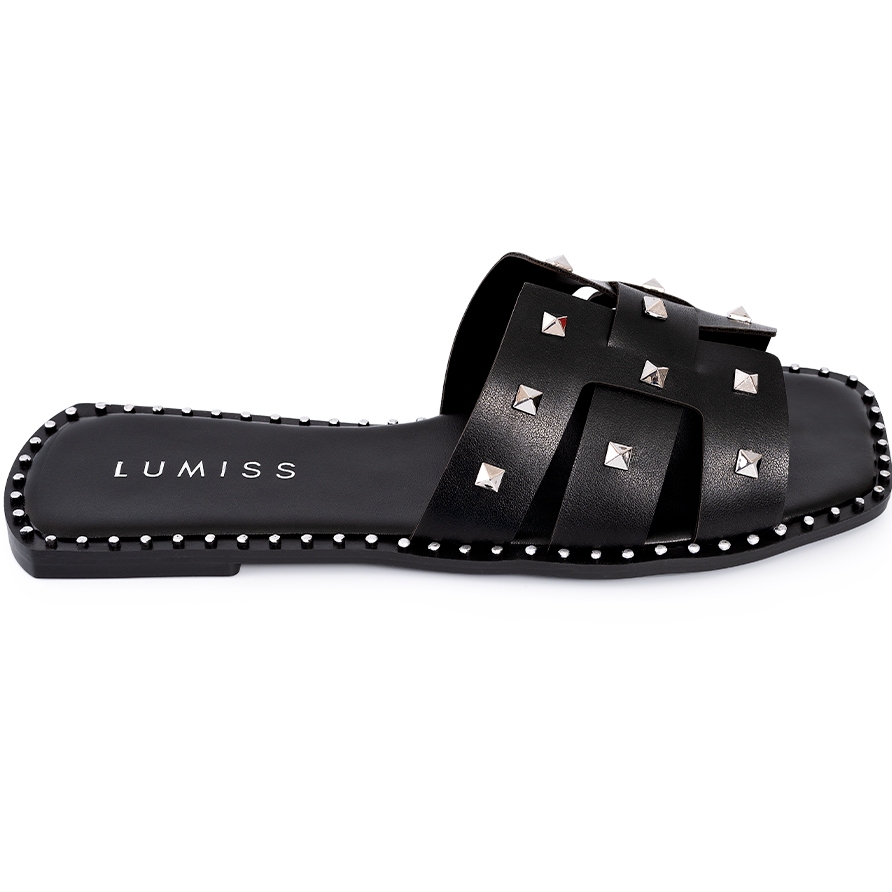 Sandália Rasteira Feminina Lumiss Confortável Blogueira Bico Quadrado Tachas Spike Pirâmide Preto