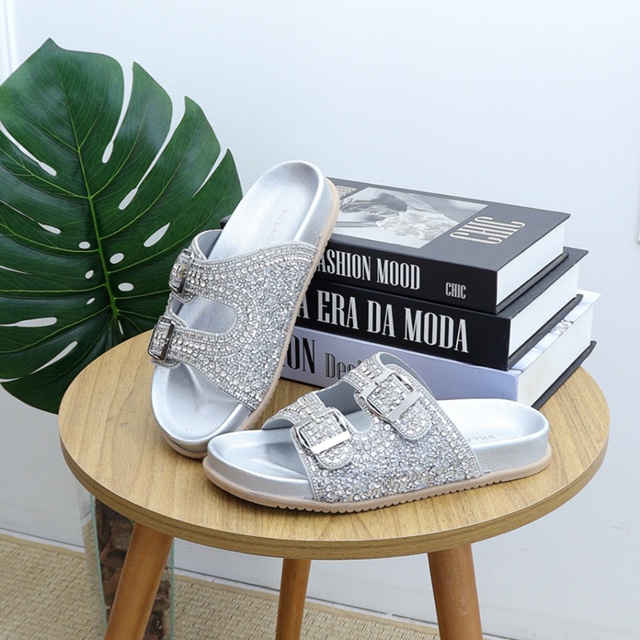 Sandália Rasteira Papete Brilho Flor de Griffe Confortável Elegante Pedraria Anatômico