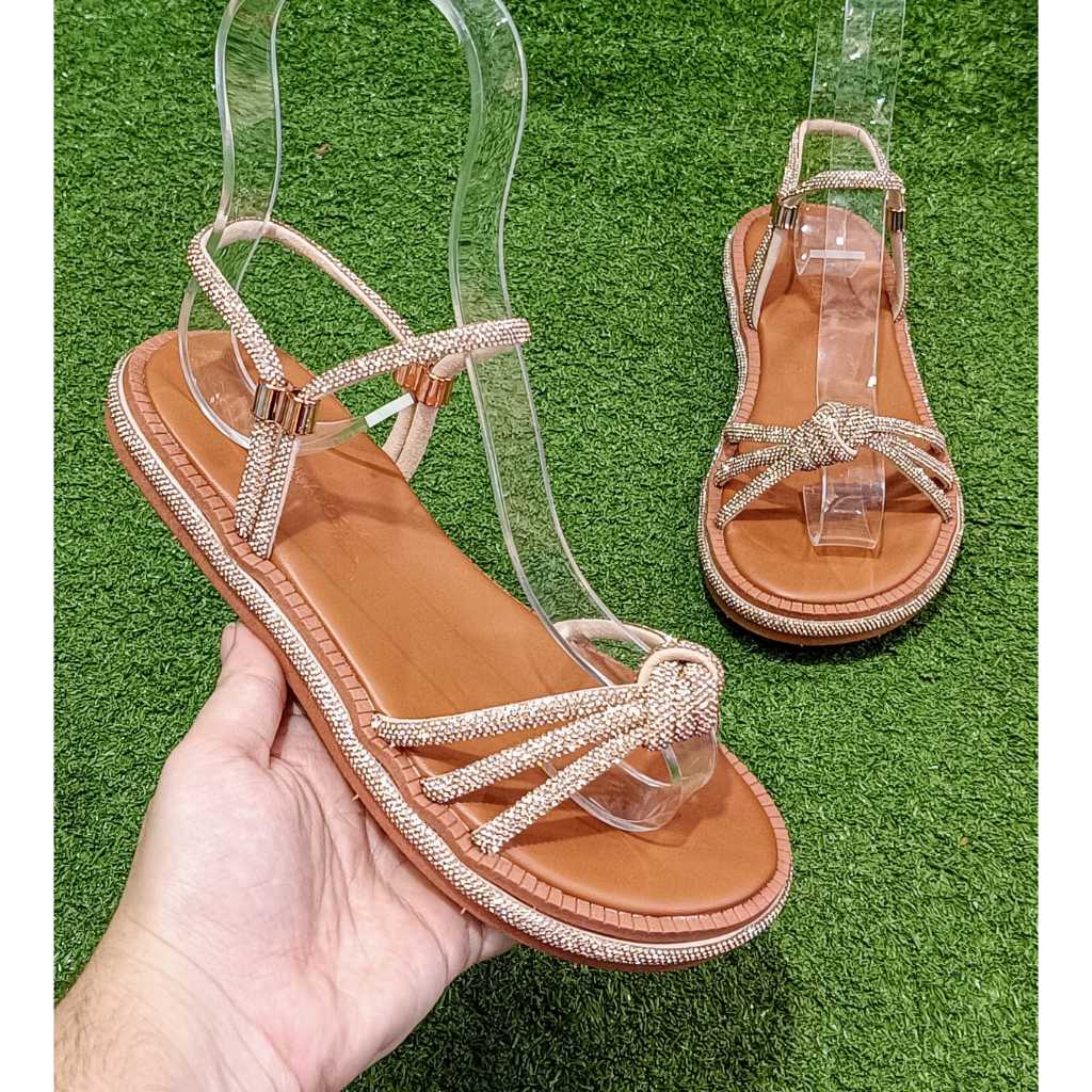 Sandália Rasteira Rosê Feminina com Strass brilho e Nó Decorativo - Lançamento