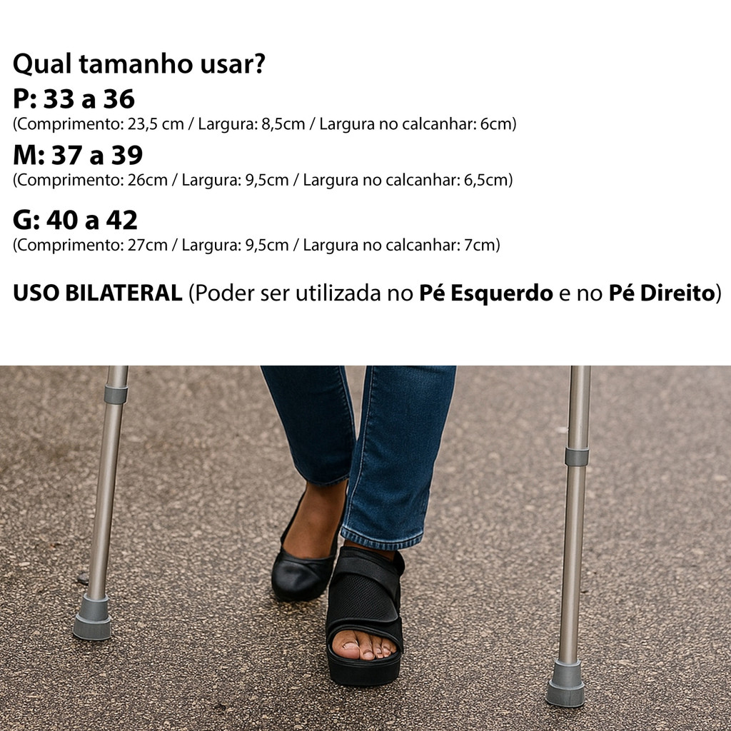 Mais de 15 anos de experiência no mercado com os melhores produtos e o melhor atendimento! Sandália Pós Cirúrgica Reta Ortofly Confortável A Sandália Reta Pós Cirúrgica Ortofly é indicada para pacientes que estão na fase de tratamento e recuperação devido a fraturas ósseas e osteotomias, para pessoas que possuem qualquer tipo de deformidade nos pés e para tratamento de hallux valgus (joanete) e ulcerações das cabeças metatarsianas. Seu material confortável dará firmeza e proteção ao paciente, além de não agredir a pele, também não provoca alergias, ideal para pessoas com mais sensibilidade. Possui fecho em tecido auto aderente que permite o ajuste ideal no pé, a sandália é bilateral, o que significa que pode ser utilizada em ambos os pés sem distinção de lado. DIFERENCIAIS E BENEFÍCIOS - Não provoca alergias e não agride a pele do usuário; - Mais firmeza e proteção para o paciente; - Fecho em velcro para ajuste ideal; - Bilateral, não possui distinção de lado, serve para ambos os pés; - Diferentes tamanhos CARACTERÍSTICAS Cor: Preta Tamanhos: P, M e G (escolha o tamanho desejado na variação do anúncio Dimensões: P do 33 a 36 ( Comprimento: 23,5 cm / Largura: 8,5cm / Largura no calcanhar: 6 cm Altura do solado: 3 cm / Peso: 184 gramas); M do 37 a 39 ( Comprimento: 26 cm / Largura: 9,5cm / Largura no calcanhar: 6,5 cm Altura do solado: 3 cm / Peso: 209 gramas); G do 40 a 42 ( Comprimento: 27 cm / Largura: 9,5cm / Largura no calcanhar: 7 cm Altura do solado: 3 cm / Peso: 215 gramas); OBS: esta sandália é vendida por unidade e não par (caso queira o par, basta comprar duas unidades). Todas as informações técnicas são repassadas conforme a descrição do fabricante.