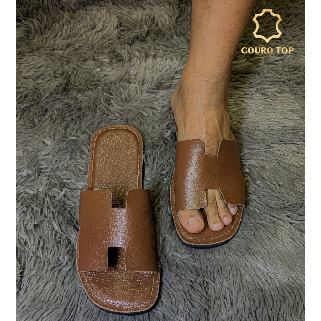 SANDÁLIA SLIDE MODELO H EM COURO BOVINO LEGÍTIMO ARTESANAL - PANTUFA EM COURO