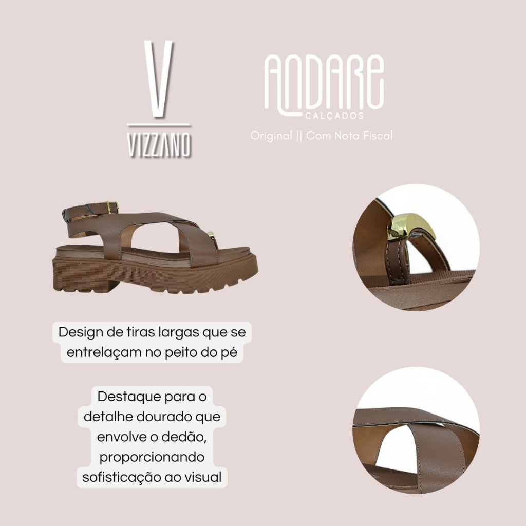 FORMA: Normal (Ver tabela de medidas) CABEDAL: Material sintético de alta qualidade PALMILHA: Anatômica acolchoada FECHAMENTO: Fivela metálica ajustável SALTO: 4cm SOLADO: Antiderrapante ENVIO: Na caixa do fabricante GARANTIA: Contra defeitos de fabricação - 30 dias A Sandália Vizzano Tratorada Metal Dourado Dedão é a escolha perfeita para quem deseja unir elegância, estilo contemporâneo e muito conforto em um único calçado. Com uma proposta moderna e cheia de personalidade, ela eleva qualquer produção com um toque de sofisticação e ousadia, sendo ideal para ocasiões casuais ou momentos especiais que pedem um visual marcante. Confeccionada em material sintético de alta qualidade, a sandália apresenta excelente durabilidade, resistência ao uso diário e fácil manutenção. Sua estrutura foi desenvolvida para garantir conforto ao longo do dia sem abrir mão da estética refinada, característica marcante da marca Vizzano. O design traz tiras largas que se cruzam sobre o peito do pé, criando um visual imponente e feminino ao mesmo tempo. O grande destaque da peça é o detalhe metálico dourado que envolve o dedão, uma tendência que agrega sofisticação e modernidade a produção, tornando o modelo um verdadeiro item de desejo para quem ama seguir as últimas tendências da moda. Seu sistema de fechamento é feito por meio de fivela metálica ajustável, que além de prática, oferece um ajuste personalizado e seguro, proporcionando firmeza ao caminhar e facilitando o calce no dia a dia. O conforto também é um dos pontos altos da sandália. Sua palmilha é anatômica e acolchoada, extremamente macia, garantindo bem-estar mesmo em longos períodos de uso. Ideal para quem preza por beleza e conforto em todos os momentos. A sandália conta com salto robusto em plataforma, com aproximadamente 4 cm de altura oferecendo estabilidade, imponência e aquele toque fashion que eleva a silhueta com naturalidade e segurança. Por fim, o solado tratorado com frisos antiderrapantes garante excelente aderência e tração em diferentes tipos de solo, proporcionando segurança a cada passo. A Sandália Vizzano Tratorada é o equilíbrio perfeito entre tendência, conforto e atitude. TABELA DE MEDIDAS Tamanho 34 - 23.3cm Tamanho 35 - 23.9cm Tamanho 36 - 24.5cm Tamanho 37 - 25.7cm Tamanho 38 - 26.9cm Tamanho 39 - 27.6cm Tamanho 40 - 28.2cm