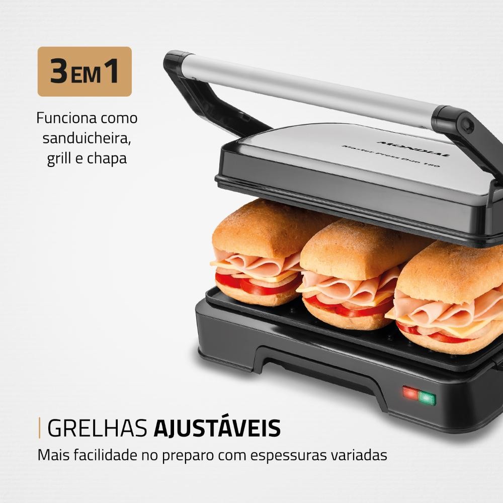 Perfeito para uma rotina com mais sabor e praticidade! A Sanduicheira Mondial Master Press Duo PG-01-180 possui abertura 180° que garante mais praticidade ao usar as duas chapas ao mesmo tempo. Ele é 3 em 1: funciona como Grill, Chapa e Sanduicheira. Possui revestimento antiaderente e grelhas duplas, que grelham por igual os dois lados do alimento sem grudar. Especificações: - Comprimento: 28,3 cm - Largura: 23,6 cm - Altura: 7,8 cm - Peso: 1,1 kg - Tensão / Voltagem: 127V - ABERTURA 180°: Pode usar aberto ou fechado. Grelha o dobro de alimentos de uma só vez. - 3 EM 1: Funciona como Sanduicheira, Grill e Chapa. - CHAPA LISA + CHAPA ONDULADA: Grelham por igual os dois lados do alimento. - CHAPAS AJUSTÁVEIS: Mais facilidade no preparo de alimentos com espessuras variadas. - REVESTIMENTO ANTIADERENTE: Evita que os alimentos grudem e facilita limpeza. - VERSATILIDADE DE RECEITAS: Você pode preparar Grelhados, Sanduíches, Espetinhos, Vegetais, Panquecas, Ovos e muito mais. - ALÇA FRONTAL ISOTÉRMICA: A alça não aquece e permite o manuseio do aparelho com segurança. - FÁCIL DE GUARDAR: Possui trava de armazenamento e pode ser guardado na vertical. - BANDEJA COLETORA: Um sistema para facilitar a limpeza do seu Grill. A gordura em excesso cai no recipiente e pode ser descartada. - LÂMPADA PILOTO: Indica o funcionamento do produto. - CORES: Preto/Inox - As configurações do seu monitor ou dispositivo móvel podem afetar a tonalidade da cor do produto. Conferir na descrição. - Produtos de Enfeite Não Estão Inclusos.