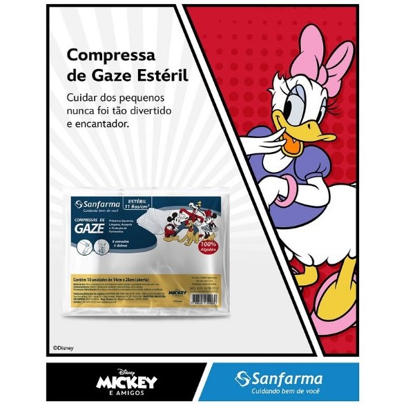 A Compressa de Gaze Estéril 11 Fios Mickey & Amigos é 100% algodão e esterilizada a raio gama cobalto. Indicada para utilização em assepsias, primeiros socorros e limpeza. Qual o benefício da compressa estéril? Até o momento da abertura da embalagem, o produto está 100% isento de contaminações por micro-organismos (fungos, bactérias e vírus).