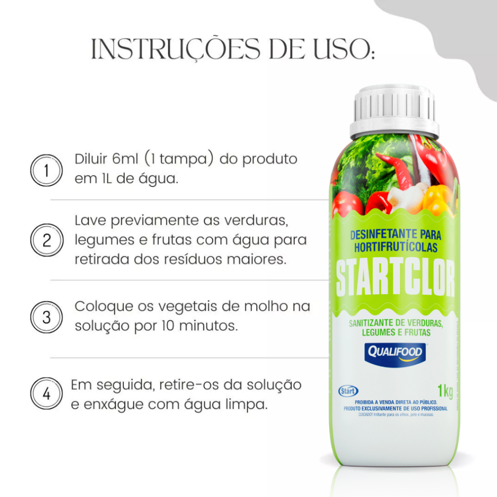 Descrição do Produto: STARTCLOR - Sanitizador Alimentício 🌿 Transforme a maneira como você prepara seus alimentos com o STARTCLOR, seu aliado na segurança alimentar. Este sanitizador foi especialmente formulado para limpar e desinfetar verduras, legumes e frutas de maneira eficaz e segura. Características Principais: Fórmula Segura e Eficiente: O STARTCLOR utiliza uma fórmula balanceada que combina poder de limpeza com segurança alimentar, garantindo a remoção de resíduos e microorganismos indesejados. Fácil de Usar: Basta diluir 50g do produto em 10 litros de água limpa para criar uma solução de sanitização eficaz. Uso Versátil: Ideal para uso doméstico ou comercial em cozinhas, restaurantes, e onde mais a limpeza sanitária de alimentos é essencial. Modo de Uso: Após lavar os alimentos, deixe-os de molho na solução por 10 minutos e enxágue com água limpa para resultados ótimos. Especificações: Volume da Embalagem: 1KG Finalidade de Uso: Alimentícia Instruções de Uso: Detalhes completos na embalagem. Proteja sua família ou clientes com o STARTCLOR. Adquira agora e leve mais segurança para sua cozinha! 🍽️💧