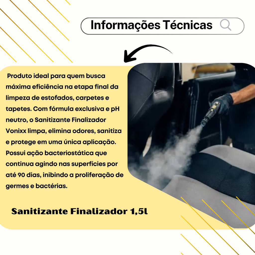 🚘 Bem-vindo!! Você está em uma loja especializada em soluções automotivas seguras e confiáveis. Aqui, cada detalhe é pensado para cuidar do que move você: sua família, sua segurança e seus melhores momentos na estrada. 🧴 Sanitizante Finalizador 1,5L – Vonixx O Sanitizante Finalizador Vonixx é um produto 4x1, desenvolvido especialmente para aplicação por pulverização na última etapa da limpeza de estofados, carpetes e tapetes. Sua fórmula elimina germes e bactérias e deixa ativo residual bacteriostático por até 3 meses. Além disso, oferece aroma agradável e toque de maciez nas fibras. 🔢 Referências Compatíveis 35483 2011051 🛠️ Informações do Produto Marca: Vonixx Tipo: Sanitizante Finalizador 1,5L Condição: Novo Volume: 1,5L Aparência: Líquida Aplicação: Manual, pincel, aplicador Garantia: 90 dias ⚠️ Antes de realizar seu pedido, esclareça suas dúvidas. 🎯 Aplicações Recomendado para uso em: 🛋️ Estofados (tecidos naturais ou sintéticos) 🧶 Carpetes 🏠 Tapetes 🚗 Interiores de veículos e ambientes fechados 🌟 Principais Características 🧼 Ação 4 em 1 Limpa, sanitiza, amacia e perfuma. 🦠 Poder Sanitizante Contém quaternário de amônio especial, altamente eficaz contra fungos e bactérias. 🛡️ Efeito Residual Duradouro Ativo bacteriostático que reduz o crescimento de germes por até 3 meses. 🧵 Toque de Maciez Fibras ficam mais suaves após a aplicação. 🌸 Fragrância Agradável Disponível em diferentes aromas (Fresh, Frutal, Bom Ar, Carro Novo). 🧩 Versatilidade Compatível com tecidos naturais e sintéticos, ideal para veículos e residências. ⚖️ pH Neutro Seguro para a maioria dos tecidos, desde que realizado o teste de compatibilidade. 💧 Diluição Econômica Proporção 1:10, garantindo excelente rendimento. 📘 Modo de Usar 1️⃣ Diluição Proporção: 1 parte de produto para 10 partes de água (1:10) Exemplo: 100 ml de produto + 1 L de água Pode ajustar conforme intensidade do aroma desejado 2️⃣ Preparação da Superfície Limpe previamente com extrator (como Extractus ou Vertex) Superfície deve estar levemente úmida ou seca 3️⃣ Aplicação Transfira a solução para um pulverizador Pulverize fina névoa, sem encharcar o tecido 4️⃣ Tempo de Ação Deixe agir por aproximadamente 10 minutos para plena eficiência sanitizante 5️⃣ Finalização Use extratora ou aspirador de líquidos para remover excesso Não é necessário enxaguar 6️⃣ Secagem Deixe secar completamente em ambiente ventilado 🛒 Onde Comprar Adquira agora o Sanitizante Finalizador 1,5L – Vonixx em uma de nossas Lojas Oficiais: Camillo Parts, Genuine Automotive ou Edumac Parts. Garanta um produto de alta qualidade, com garantia e suporte dedicado. ⚠️ Aviso Legal Proibimos o uso, cópia ou alteração de nossas fotos, imagens e conteúdo presentes nos anúncios. De acordo com a Lei 9.610/98, qualquer violação será tratada legalmente, pois possuímos direitos autorais sobre este material.