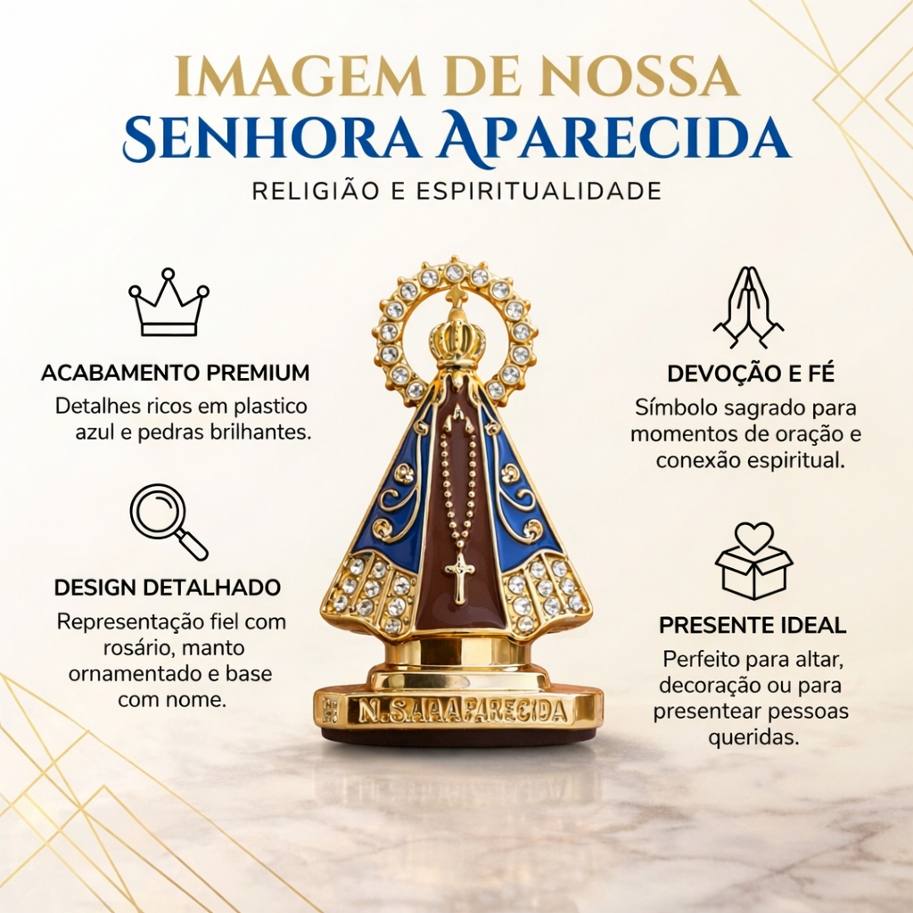 🙏 Nossa Senhora Aparecida para Painel de Carro – Proteção e Fé no Seu Caminho Leve a proteção da Padroeira do Brasil com você em todos os trajetos. Essa linda imagem de Nossa Senhora Aparecida é ideal para fixar no painel do carro através de fita dupla face de alta fixação, proporcionando segurança e estabilidade. ✨ Acabamento detalhado e delicado ✨ Aplicações com brilho ✨ Fixação prática com fita dupla face ✨ Ideal para carro, caminhão ou ambientes internos Mais do que um acessório automotivo, é um símbolo de fé, proteção e esperança. Perfeita para: 🙏 Proteger suas viagens 🙏 Presentear alguém especial 🙏 Decorar o painel com significado 🙏 Ter sempre por perto sua devoção Que Nossa Senhora Aparecida abençoe seus caminhos e guarde você e sua família. 📦 Produto pronto para envio 🚚 Envio rápido e embalagem segura