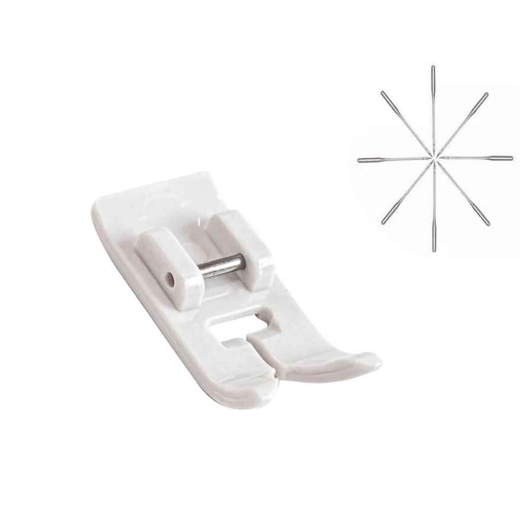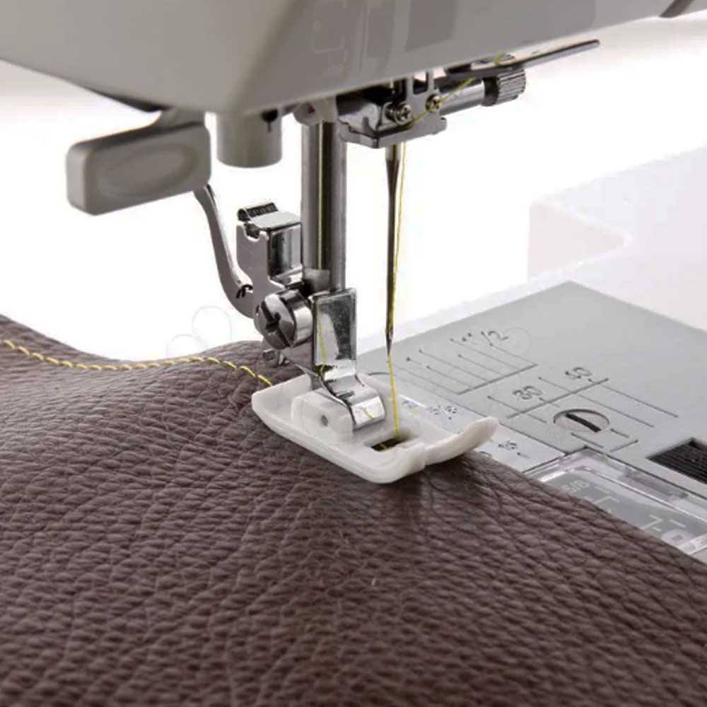 Sapata de Teflon para uso geral, especialmente utilizada em plasticos pois permite que deslize mais facilmente sobre o material. - Sistema de encaixe facil (Troca rapida) Serve em maquinas de costura domesticas como: Singer, Elgin, Janome, Brother, Elna, entre outros.