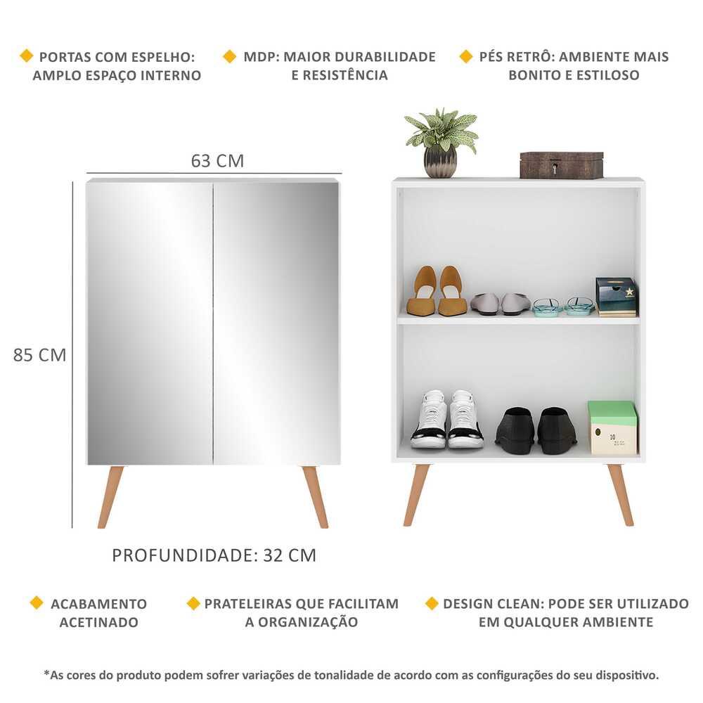 A Sapateira 2 Portas Retrô com Espelho Nina Multimóveis é produzida em MDP com acabamento acetinado (cerca de 20% de brilho), que garante maior durabilidade, facilidade na limpeza, além de um acabamento superior. Com 2 portas, possui um excelente espaço interno para acomodar seus sapatos e demais pertences (a prateleira interna suporta 8 Kg e o tampo 9 Kg). Os pés retrô, em polipropileno, dão um charme especial ao móvel deixando-o com um visual leve e permitindo você compor um ambiente com ar vintage e moderno ao mesmo tempo. Os espelhos nas portas deixam o móvel mais requintado, criando um ambiente moderno e charmoso. Os espelhos são de vidro (o que evita que a imagem fique distorcida) e lapidados, ou seja, passam por um processo para que as bordas não fiquem cortantes, o que garante maior segurança. Compacta, é uma excelente opção para otimizar seu ambiente, para que você possa aproveitá-lo da melhor maneira possível. Conteúdo da Embalagem: 1 (uma) sapateira 1 (um) kit com 4 pés retrô 1 (um) kit com 2 espelhos Dimensões do produto montado: Altura: 85cm | Largura: 63cm | Profundidade: 32cm *Você pode consultar as medidas internas na imagem técnica do produto. Cores Disponíveis: Branco - Branco/Preto - Branco/Natural - Preto - Preto/Branco - Preto/Natural *As cores do produto podem sofrer variações de tonalidade de acordo com as configurações do seu dispositivo. Imagem meramente ilustrativa. Decoração não acompanha o produto. O produto será entregue desmontado e não disponibilizamos o serviço de montagem.