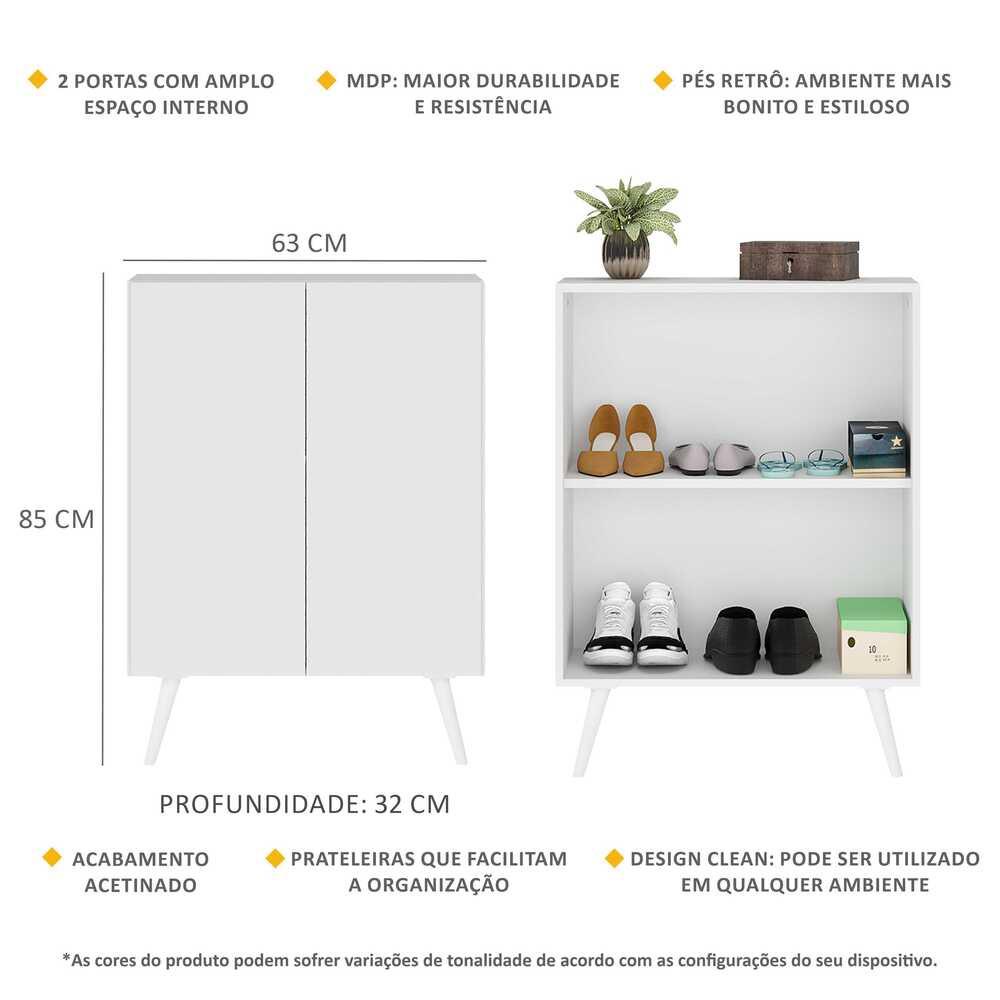 A Sapateira 2 Portas Retrô Nina Multimóveis é produzida em MDP com acabamento acetinado (cerca de 20% de brilho), que garante maior durabilidade, facilidade na limpeza, além de um acabamento superior. Com 2 portas, possui um excelente espaço interno para acomodar seus sapatos e demais pertences (a prateleira interna suporta 8 Kg e o tampo 9 Kg). Os pés retrô, em polipropileno, dão um charme especial ao móvel deixando-o com um visual leve e permitindo você compor um ambiente com ar vintage e moderno ao mesmo tempo. Compacta, é uma excelente opção para otimizar seu ambiente, para que você possa aproveitá-lo da melhor maneira possível. Conteúdo da Embalagem: 1 (uma) sapateira 1 (um) kit com 4 pés retrô Dimensões do produto montado: Altura: 85cm | Largura: 63cm | Profundidade: 32cm *Você pode consultar as medidas internas na imagem técnica do produto. *As cores do produto podem sofrer variações de tonalidade de acordo com as configurações do seu dispositivo. Imagem meramente ilustrativa. Decoração não acompanha o produto. O produto será entregue desmontado e não disponibilizamos o serviço de montagem.