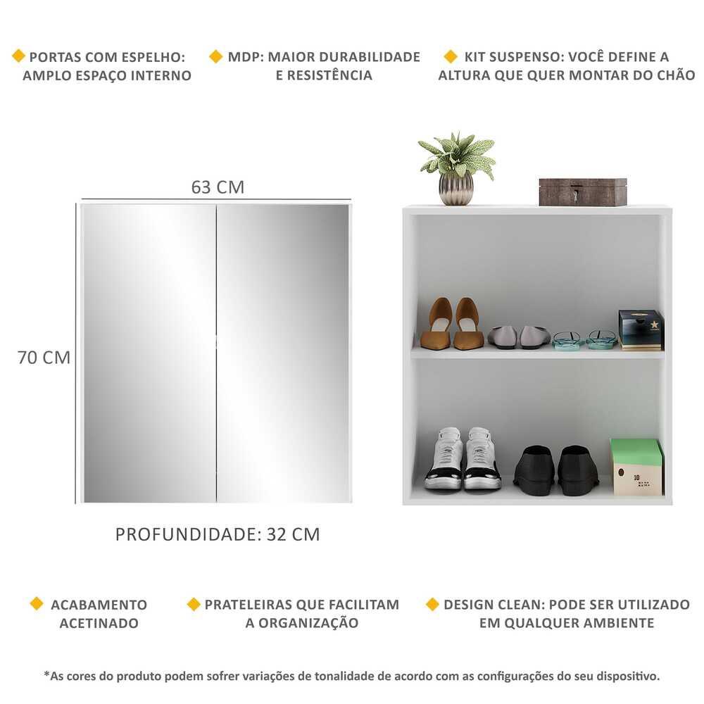 A Sapateira 2 Portas Suspensa com Espelho Nina Multimóveis é produzida em MDP com acabamento acetinado (cerca de 20% de brilho), que garante maior durabilidade, facilidade na limpeza, além de um acabamento superior. Com 2 portas, possui um excelente espaço interno para acomodar seus sapatos e demais pertences (a prateleira interna suporta 8 Kg e o tampo 9 Kg) e ainda acompanha kit para ser montada de forma suspensa, conforme a altura que você quiser do chão. Os espelhos nas portas deixam o móvel mais requintado, criando um ambiente moderno e charmoso. Os espelhos são de vidro (o que evita que a imagem fique distorcida) e lapidados, ou seja, passam por um processo para que as bordas não fiquem cortantes, o que garante maior segurança. Compacta, é uma excelente opção para otimizar seu ambiente, para que você possa aproveitá-lo da melhor maneira possível. Conteúdo da Embalagem: 1 (uma) sapateira 1 (um) kit com suporte para sapateira 1 (um) kit com 2 espelhos Dimensões do produto montado: Altura: 70cm | Largura: 63cm | Profundidade: 32cm *Você pode consultar as medidas internas na imagem técnica do produto. *As cores do produto podem sofrer variações de tonalidade de acordo com as configurações do seu dispositivo. Imagem meramente ilustrativa. Decoração não acompanha o produto. O produto será entregue desmontado e não disponibilizamos o serviço de montagem.