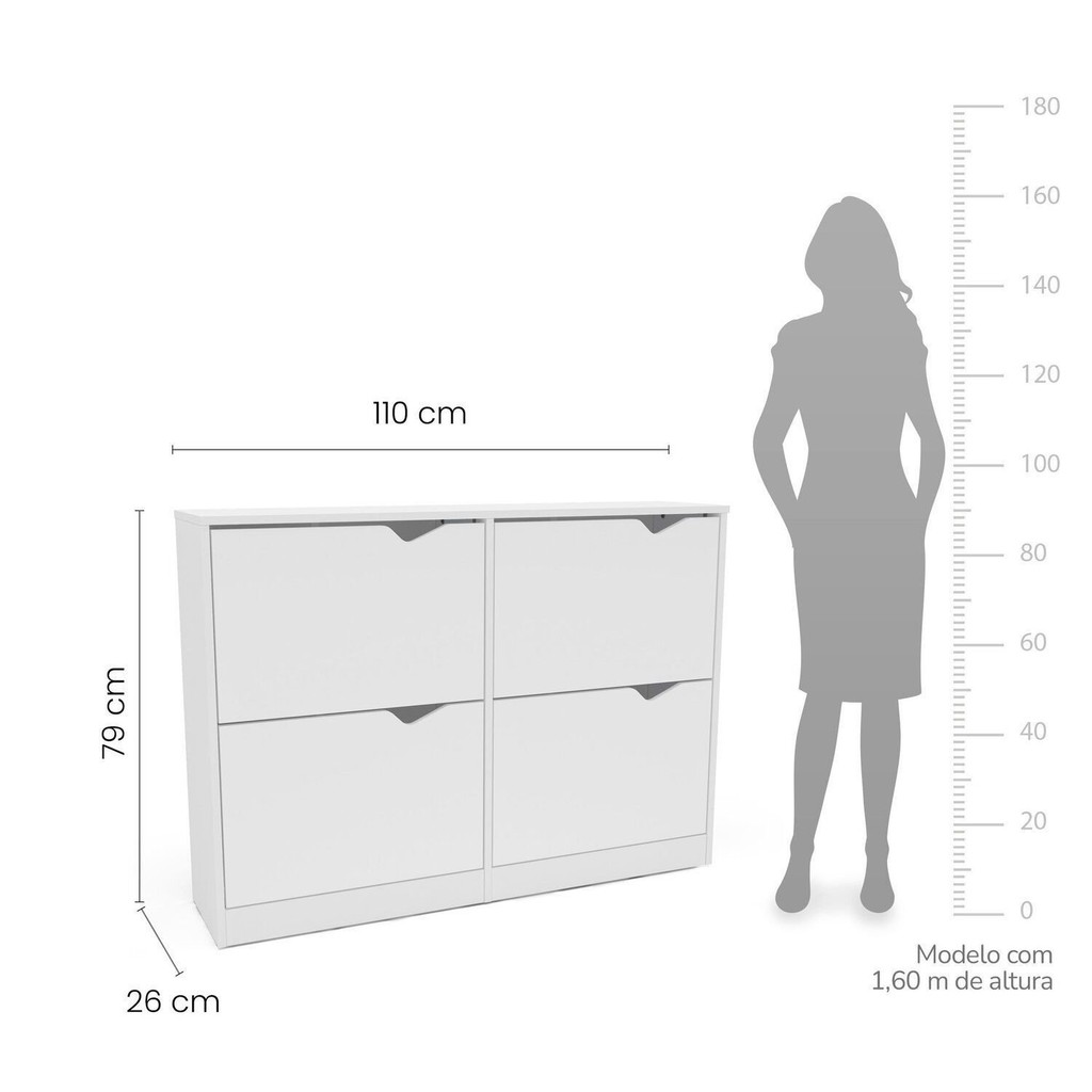 A Sapateira Porto da Politorno Móveis é a escolha ideal para quem deseja manter os calçados organizados com praticidade e estilo. Com capacidade para até 24 pares, ela oferece amplo espaço interno sem ocupar muito do ambiente, graças às suas medidas compactas de 110 cm de largura, 79 cm de altura e 26 cm de profundidade. Seu design moderno e discreto combina com diversos estilos de decoração, enquanto o acabamento em pintura UV branco semi fosco confere um toque sofisticado e fácil de manter no dia a dia. Fabricada em MDP de qualidade, é resistente, durável e perfeita para ser usada em quartos, corredores, closets ou halls de entrada, trazendo organização com elegância e funcionalidade. Estilo: Moderno Peso (kg): 16.94 Garantia: 06 Meses Altura (cm): 79 Acabamento: Pintura UV Largura (cm): 110 Possui Pés: Não Possui Portas: Sim Tipo de Porta: Basculante Possui Gavetas: Não Suporta Até (kg): 10 Profundidade (cm): 26 Escala de Brilho: Semi-Fosco Serviço Montagem: 114259443 Material da Porta: MDP Origem do Produto: Nacional Ambiente Principal: Quarto Material Principal: MDP Possui Prateleiras: Não Acabamento da Porta: Pintura UV Sapatas Niveladoras: Não Tipo de Puxador da Porta: Embutido Escala de Brilho da Porta: Semi-Fosco Suporta Quantos Pares de Calçados: 21 a 30 Pares Tipo de Dobradiça/Corrediça da Porta: Plástica Marca: Politorno Cor Flex: Branco Cor Interna: Branco Cor: Branco Cor do Produto: Branco Itens Inclusos: 1 Sapateira, Kit de Ferragens, Manual de Montagem e Termo de Garantia Cor Predominante: Branco Linha ou Coleção: Porto Quantidade de Gavetas: Não Possui