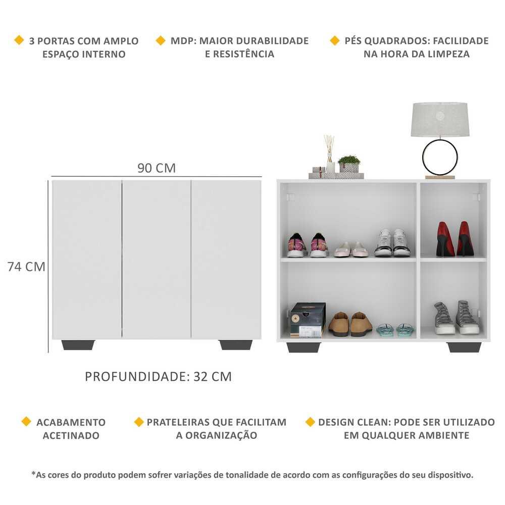 A Sapateira 3 Portas Nina Multimóveis é produzida em MDP com acabamento acetinado (cerca de 20% de brilho), que garante maior durabilidade, facilidade na limpeza, além de um acabamento superior. Com 3 portas, possui um excelente espaço interno para acomodar seus sapatos e demais pertences (as prateleiras internas suportam 2 e 5 Kg e o tampo 7 Kg). Os pés quadrados, em polipropileno, facilitam na hora da limpeza. Compacta, é uma excelente opção para otimizar seu ambiente, para que você possa aproveitá-lo da melhor maneira possível. Conteúdo da Embalagem: 1 (uma) sapateira 1 (um) kit com 4 pés quadrados Dimensões do produto montado: Altura: 74cm | Largura: 90cm | Profundidade: 32cm *Você pode consultar as medidas internas na imagem técnica do produto. *As cores do produto podem sofrer variações de tonalidade de acordo com as configurações do seu dispositivo. *Para maior segurança, acompanha sistema anti-tombamento. Sugerimos fixar o móvel na parede. Imagem meramente ilustrativa. Decoração não acompanha o produto. O produto será entregue desmontado e não disponibilizamos o serviço de montagem.