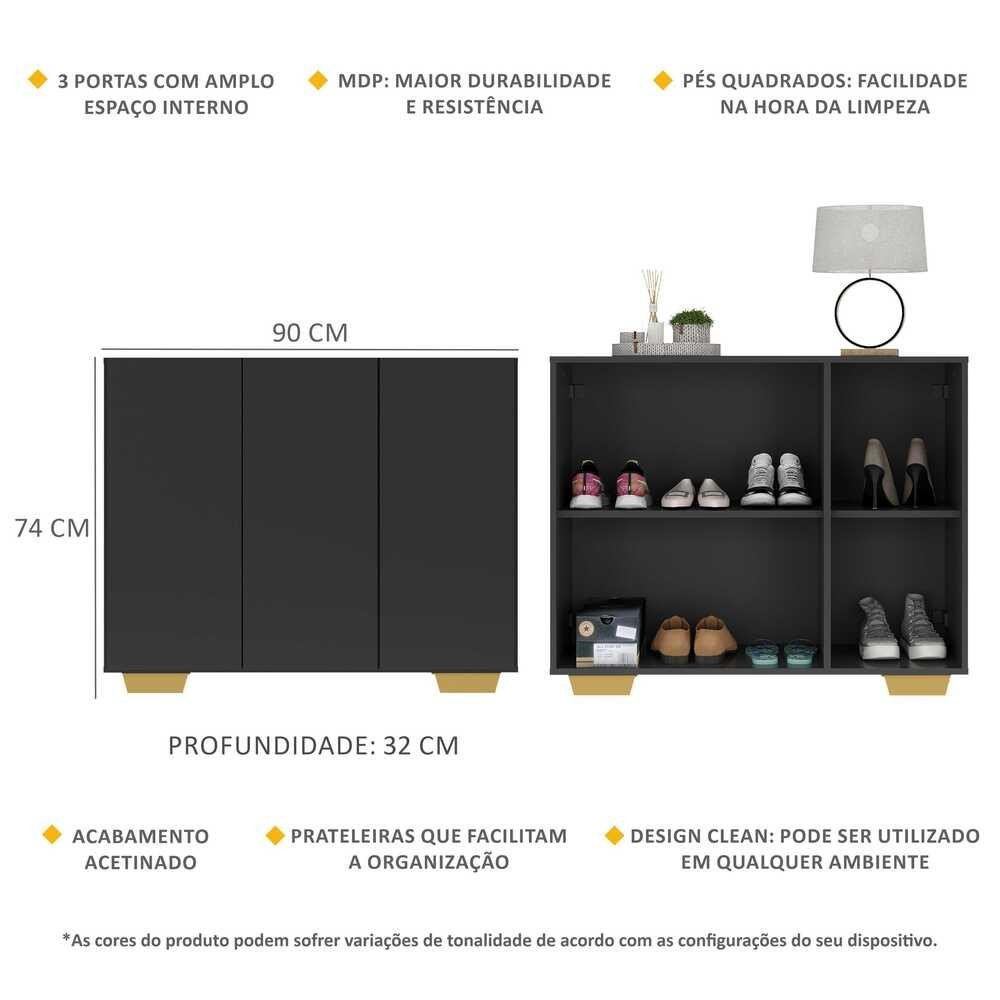 A Sapateira 3 Portas Nina Multimóveis é produzida em MDP com acabamento acetinado (cerca de 20% de brilho), que garante maior durabilidade, facilidade na limpeza, além de um acabamento superior. Com 3 portas, possui um excelente espaço interno para acomodar seus sapatos e demais pertences (as prateleiras internas suportam 2 e 5 Kg e o tampo 7 Kg). Os pés quadrados, em polipropileno, facilitam na hora da limpeza. Compacta, é uma excelente opção para otimizar seu ambiente, para que você possa aproveitá-lo da melhor maneira possível. Conteúdo da Embalagem: 1 (uma) sapateira 1 (um) kit com 4 pés quadrados Dimensões do produto montado: Altura: 74cm | Largura: 90cm | Profundidade: 32cm *Você pode consultar as medidas internas na imagem técnica do produto. *As cores do produto podem sofrer variações de tonalidade de acordo com as configurações do seu dispositivo. *Para maior segurança, acompanha sistema anti-tombamento. Sugerimos fixar o móvel na parede. Imagem meramente ilustrativa. Decoração não acompanha o produto. O produto será entregue desmontado e não disponibilizamos o serviço de montagem.