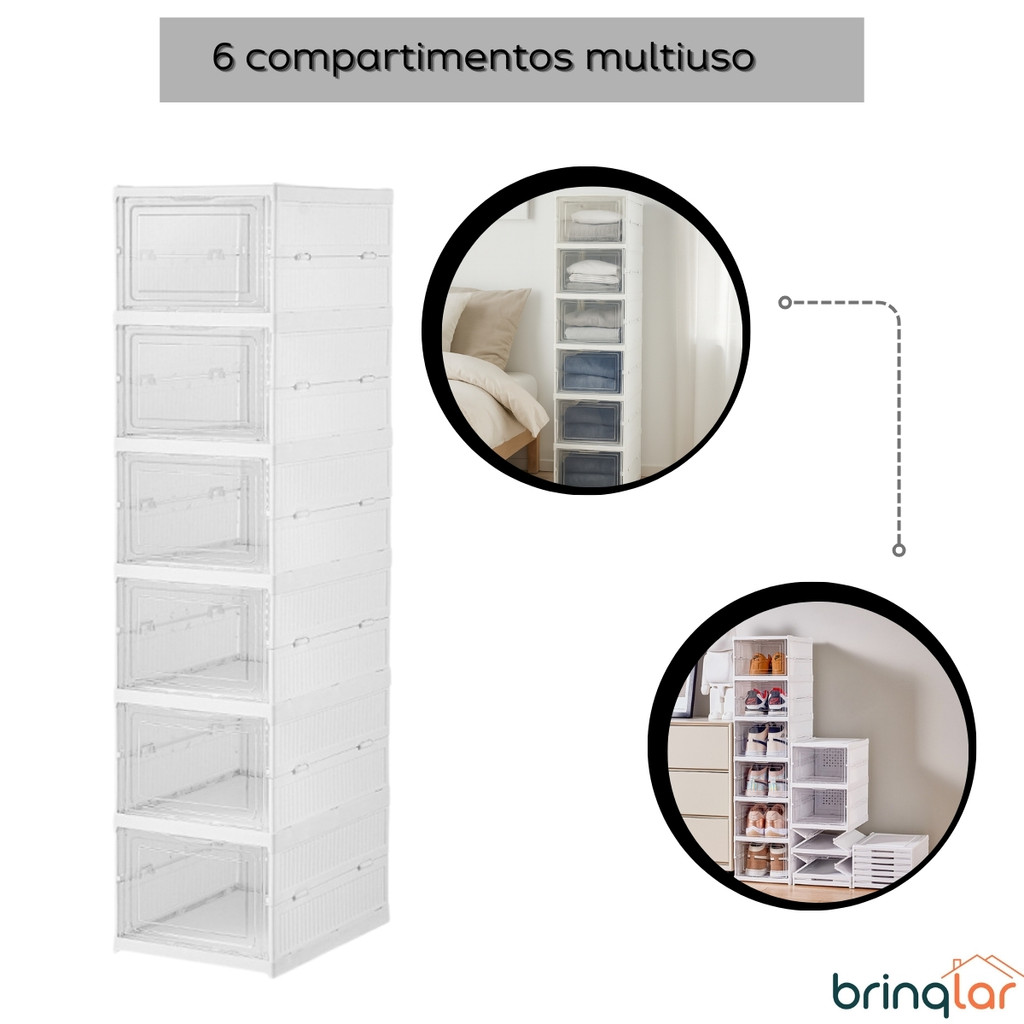 O anúncio contém: 01 Caixa Organizadora de Sapatos com 6 Camadas. Perguntas Frequentes: 1. Quantos pares de sapatos cabem? Cada compartimento comporta 1 par de sapatos adulto (dependendo do modelo), totalizando 6 pares no conjunto completo. 2. As caixas são resistentes? Sim, fabricadas em plástico de alta qualidade, garantem durabilidade e firmeza para o uso diário. 3. É fácil de montar e desmontar? Sim, o sistema de encaixe é simples e rápido, sem necessidade de ferramentas. 4. Posso usar para outros itens além de sapatos? Sim, ideal também para bolsas, brinquedos, roupas dobradas ou acessórios. 5. É possível abrir individualmente cada compartimento? Sim, cada camada possui porta frontal independente, facilitando o acesso sem precisar desmontar a pilha. Caixa Organizadora de Sapatos 6 Camadas – Praticidade e Organização para Seu Ambiente Perfeita para quem busca organização e economia de espaço, esta caixa de sapatos com 6 camadas mantém os calçados sempre visíveis e protegidos contra poeira. O design modular permite empilhar e acessar cada compartimento de forma prática e segura. Destaques do Produto: 6 compartimentos individuais com portas frontais para acesso rápido. Plástico resistente que garante durabilidade e fácil limpeza. Design empilhável e modular, ideal para closets, quartos, lavanderias e halls de entrada. Versátil: pode ser usado para sapatos, bolsas, brinquedos ou roupas. Montagem simples com sistema de encaixe, sem necessidade de ferramentas. Especificações Técnicas: Dimensões do produto montado (AxLxC): 104cm x 34cm x 25cm. Dimensões de cada caixa (fechada) (AxLxC): 26cm x 25cm x 19cm. Material: Plástico resistente de alta qualidade Cor: Transparente/Branco (conforme lote de fabricação) Capacidade: 6 pares de sapatos adultos (ou mais, dependendo do tamanho e tipo). Fabricante: Brinqlar. Observações: Produto novo e em estoque. Todos os produtos têm seguro contra extravio. As cores podem variar levemente conforme o lote de fabricação. Todas as informações são de responsabilidade do fabricante e/ou fornecedor.