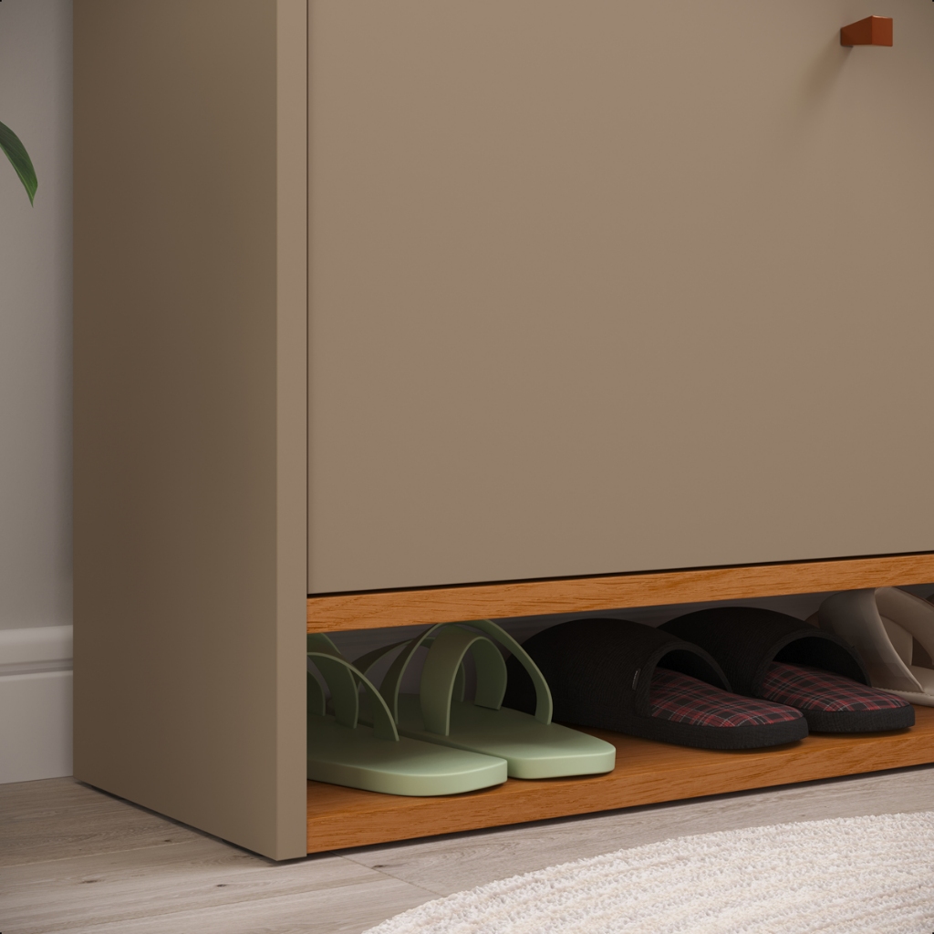 Sapateira Safira Organize seus calçados com praticidade e elegância. A sapateira com 2 portas basculantes é ideal para quem busca otimizar espaço sem abrir mão do estilo. Com design moderno, combina facilmente com diversos ambientes como quarto, hall de entrada ou closet. Medidas do Produto Montado: Altura: 78 cm Largura: 67,5 cm Profundidade: 22 cm Destaques do Produto: - Design moderno e minimalista - 2 portas basculantes com excelente aproveitamento interno - Ideal para ambientes compactos - Estrutura resistente e durável - Puxadores discretos - Espaço inferior adicional para acomodar mais pares de sapatos Informações Importantes: Produto enviado desmontado. Acompanha manual de montagem e kit de ferragens. Recomendamos que a montagem seja realizada por um profissional. Imagem meramente ilustrativa. Objetos decorativos não acompanham o produto. Ideal para manter seus calçados organizados e proporcionar mais funcionalidade ao ambiente