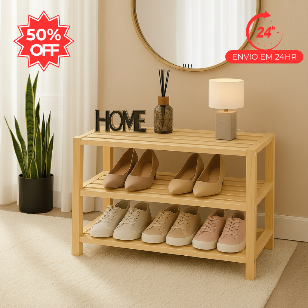 Envio em 24 Horas Após A Confirmação do Pedido Sapateira de Madeira de Pinus C Prateleiras Acabamento Liso Cor Natural Multiuso Pode ser usada como floreira para suas plantinhas! Ser usada como sapateira! E até mesmo para organizar aquela baguncinha em casa! Altura 50cm Largura 60cm Profundidade 25cm Requer montagem Quantidade de Prateleiras 3 Qualquer Duvida Estaremos a Disposição! Estamos entre os melhores vendedores • Bom atendimento • Envio dentro do prazo • Todas as vendas têm seguro. Entrega do produto ou seu dinheiro de volta Conteúdo da embalagem: Sapateira Casal 3 Prateleiras 9 Pares Calçados Sapatos Tênis
