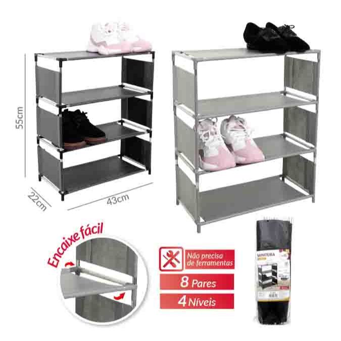 A Sapateira Prateleira Organizadora é utilizada para várias situações de organização da sua casa, possibilita que você organize seus calçados de forma prática, sem se preocupar com o espaço. Pode ser utilizada para colocar vasos de plantas, decorar, organizar livros, revistas, brinquedos e muito mais. Super fácil de montar, versátil, eficiente e funcional. Use esse item moderno para organizar sua casa de forma simples. FICHA TÉCNICA: - Sapateira com 4 prateleiras. - Cores: Preto ou Cinza (Selecione a cor desejada no anúncio) - Material: Plástico, Metal e TNT. - Item: 55cm x 43cm x 22cm (Altura x Largura x Profundidade). - Adequado para todos os ambientes. - Fácil de montar e desmontar. - Economiza espaço.
