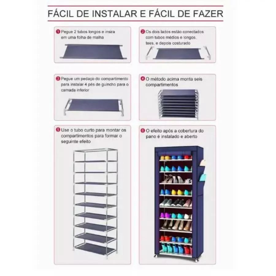 SEJA BEM VINDO A NOSSA LOJA! 👟 Sapateira Organizador Desmontável – 9 Andares Ideal para manter seus calçados sempre organizados e protegidos Opção 9 andares simples - Medidas montada: 158cm (altura) x 30cm (largura) x 58cm (comprimento) - Distância entre prateleiras: 20cm - Peso suportado por prateleira: 3Kg - Capacidade: aproximadamente 27 pares* Opção 9 andares dupla - Medidas montada: 155cm (altura) x 30cm (largura) x 120cm (comprimento) - Peso suportado por prateleira: 3Kg - Capacidade: aproximadamente 54 pares* 🔧 Características - Material da capa: TNT respirável, que protege os calçados contra poeira e mantém a ventilação. - Estrutura: Hastes de metal resistentes e tubos de encaixe em plástico de alta durabilidade. - Montagem prática: Sistema desmontável com encaixes simples, sem necessidade de ferramentas. - Versatilidade: Ideal para diferentes tipos de calçados – tênis, sapatos sociais, sandálias e botas leves. - Organização inteligente: Mantém até 27 pares (modelo simples) ou até 54 pares (modelo duplo), dependendo do tamanho dos calçados. ✨ Com essa sapateira, você ganha espaço, praticidade e organização no seu quarto, closet ou lavanderia, mantendo seus calçados sempre à mão e bem conservados. *OBSERVAÇÃO: A capacidade de armazenamento pode variar conforme o tamanho e o tipo dos calçados — sapatos maiores ocupam mais espaço que chinelos ou sapatilhas.