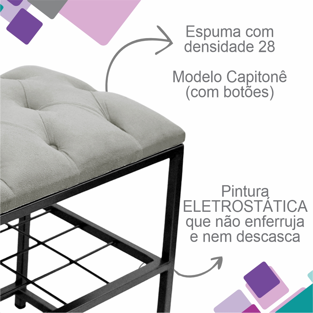 Sapateira recamier, banco ferro preto, estofada capitonê 80x50x30cm, closet, hall de entrada