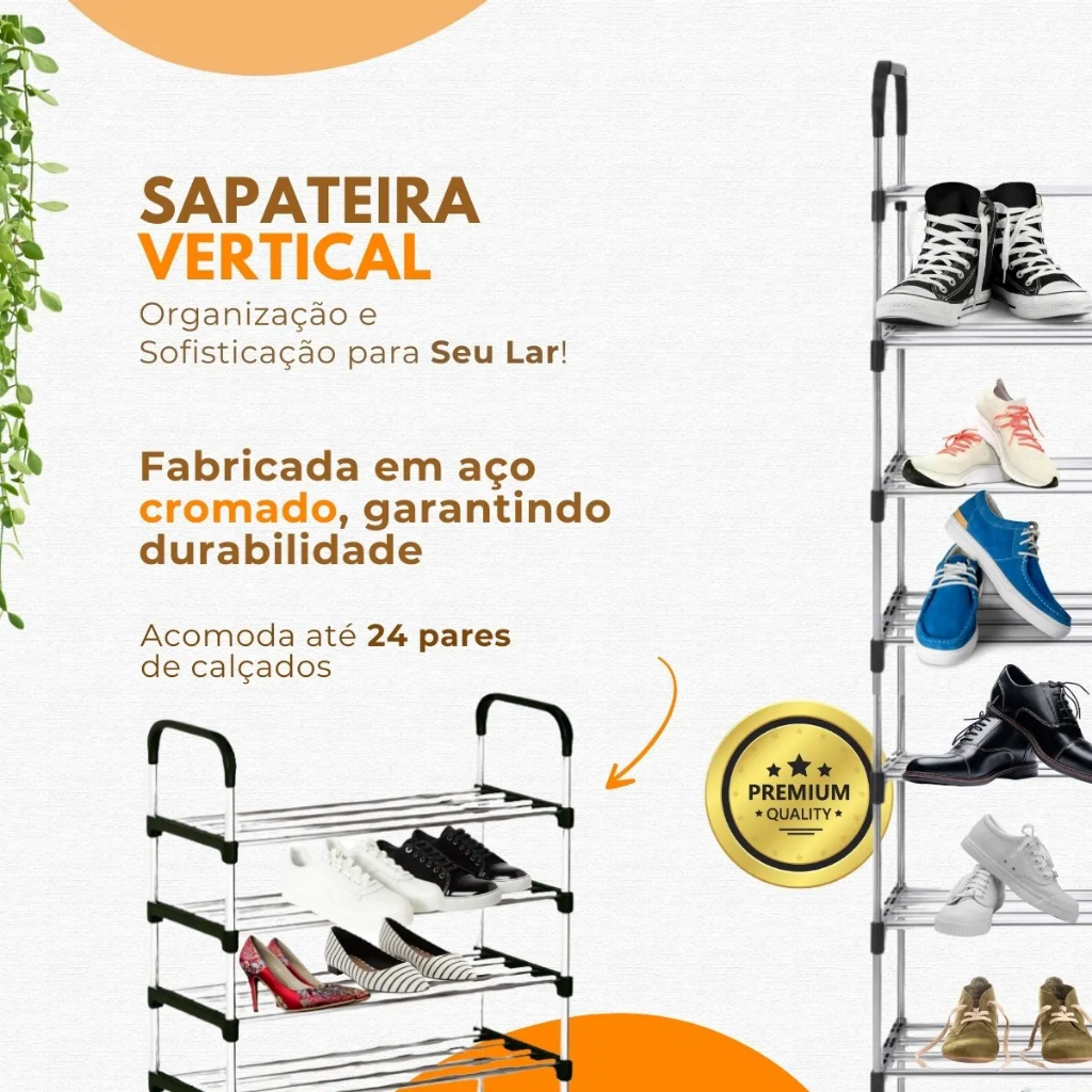 Organize seu espaço com a Sapateira Vertical Grande, um produto ideal para quem busca praticidade e estilo. Com 8 prateleiras, ela comporta até 27 pares de calçados, permitindo que você mantenha seus sapatos sempre à mão e em ordem. Seu design clássico se adapta a qualquer ambiente, seja no quarto, no hall de entrada ou no closet. Fabricada em inox e plástico premium, a sapateira é resistente e fácil de limpar, garantindo durabilidade e um visual sempre impecável. Com dimensões de 146 cm de altura, 58 cm de largura e 26 cm de profundidade, ela se encaixa perfeitamente em espaços menores, otimizando cada canto da sua casa. A montagem é simples, permitindo que você a instale rapidamente e comece a desfrutar de um ambiente mais organizado. Transforme a maneira como você armazena seus calçados e traga mais funcionalidade para o seu dia a dia com a Sapateira Vertical Grande.