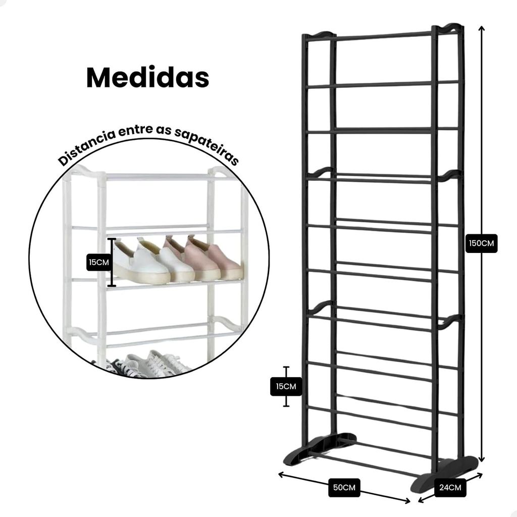 Mantenha seus calçados sempre organizados com a Sapateira Vertical para 30 Pares com 10 Prateleiras, uma aliada indispensável para quem busca praticidade e otimização de espaço. Seu design vertical e compacto permite acomodar uma grande variedade de sapatos, desde tênis e tamancos até chinelos e pequenas caixas, sem comprometer a área útil do ambiente. Fabricada com estrutura de metal e conectores plásticos reforçados, esta sapateira combina durabilidade e estabilidade, suportando até 15 kg com segurança. É ideal para uso em quartos, closets, salas ou halls de entrada, proporcionando uma organização eficiente e um visual mais limpo e sofisticado. A montagem é rápida e intuitiva, dispensando o uso de ferramentas, tornando-a perfeita para quem busca funcionalidade imediata. Versátil e elegante, a Sapateira Vertical 30 Pares é a escolha certa para quem deseja mais espaço, ordem e conforto no dia a dia. Organização Máxima com 10 Prateleiras: Acomode até 30 pares de sapatos com praticidade e elegância. Ideal para quem deseja manter calçados sempre à mão e bem organizados, sem ocupar muito espaço no ambiente. Estrutura Reforçada e Durável: Com tubos metálicos e conectores plásticos de alta qualidade, a sapateira oferece estabilidade e resistência, suportando até 15 kg de maneira segura. Design Vertical e Compacto: Seu formato vertical permite aproveitar melhor espaços pequenos como quartos, closets ou halls de entrada, deixando o ambiente mais funcional e visualmente limpo. Montagem Fácil e sem Ferramentas: Com sistema de encaixe simples, a sapateira pode ser montada e desmontada rapidamente, ideal para quem busca praticidade e quer evitar complicações. Versatilidade em Qualquer Ambiente: Além dos calçados, pode ser usada para organizar caixas, bolsas e acessórios. Uma solução moderna e funcional para quem valoriza ordem e estilo em casa. Especificações Técnicas: Altura: 150 cm Largura: 50 cm Profundidade: 24 cm Capacidade de Peso: Até 15 kg