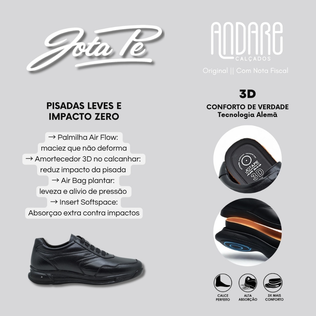 FORMA: Normal (Ver tabela de medidas). CABEDAL: Couro carneiro premium ultramacio e flexível, com acabamento artesanal que garante durabilidade e aparência refinada. DESIGN: Casual moderno com linhas limpas e visual sofisticado, ideal para uso profissional e cotidiano. FECHAMENTO: Cadarço elástico inteligente que dispensa amarração, oferecendo ajuste firme, prático e anatômico. FORRO: Interno em couro e tecido Ultra Comfort, que mantém os pés frescos, ventilados e livres de atritos. PALMILHA: Air Flow® anatômica com espuma de alta densidade, que preserva a maciez e evita deformações. AMORTECIMENTO: Tecnologia 3D Total Air® com quatro camadas — amortecimento 3D, Air Bag plantar, Insert Softspace e suporte anatômico — para máxima absorção de impacto e retorno de energia. SOLADO: PU ultraleve com excelente estabilidade, flexibilidade e tração em diferentes superfícies. INDICAÇÃO: Uso casual e profissional, ideal para quem passa longas horas em pé e busca conforto prolongado. ENVIO: Na caixa original do fabricante. GARANTIA: 30 dias contra defeitos de fabricação. O Sapato Casual 3D Evolution Jota Pe em Couro foi criado para quem busca o máximo de conforto, estilo e praticidade no dia a dia. Ideal para quem passa longas horas em pé, ele combina o visual sofisticado de um sapato casual com o conforto de um tênis, garantindo bem-estar e elegância em qualquer ocasião. Confeccionado em couro carneiro premium, o modelo é ultramacio, flexível e se adapta aos pés desde o primeiro uso. O acabamento artesanal assegura durabilidade e refinamento, enquanto a forração interna em couro e tecido Ultra Comfort mantém os pés frescos e confortáveis por muito mais tempo. O design contemporâneo e as linhas limpas tornam o 3D Evolution versátil, ideal para compor looks casuais ou profissionais. O cadarço elástico inteligente proporciona ajuste prático e firme, dispensando amarração e garantindo um calce rápido e confortável. O destaque fica por conta da tecnologia 3D Total Air®, com quatro camadas de amortecimento que reduzem o impacto e proporcionam pisadas mais leves e macias. A Palmilha Air Flow® mantém a maciez durante todo o dia, o Amortecimento 3D protege o calcanhar e a planta do pé, o Air Bag plantar devolve energia a cada passada, e o Insert Softspace garante absorção extra contra impactos. Com solado em PU ultraleve e forma anatômica, o modelo entrega estabilidade, leveza e segurança em cada movimento. O Sapato Casual Jota Pe 3D Evolution é a combinação perfeita entre conforto e elegância — feito para acompanhar o seu ritmo, do primeiro ao último passo. TABELA DE MEDIDAS Tamanho 37 - 24,7cm Tamanho 38 - 25,3cm Tamanho 39 - 26,1cm Tamanho 40 - 26,7cm Tamanho 41 - 27,3cm Tamanho 42 - 28,1cm Tamanho 43 - 28,8cm Tamanho 44 - 29,4cm Tamanho 45 - 30,1cm