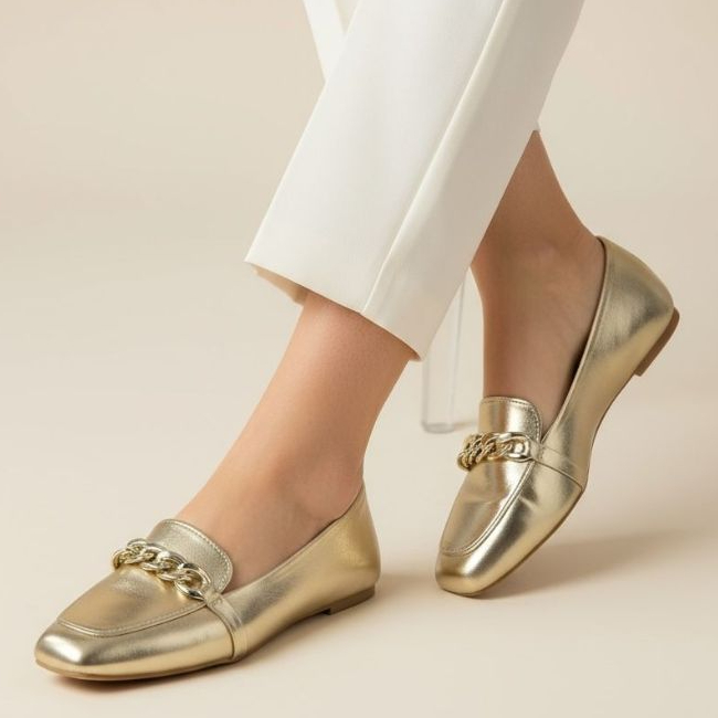 Sapatilha Feminina Confortável Luxo Elegante Sapato Feminino Mocassim Bico Quadrado Corrente