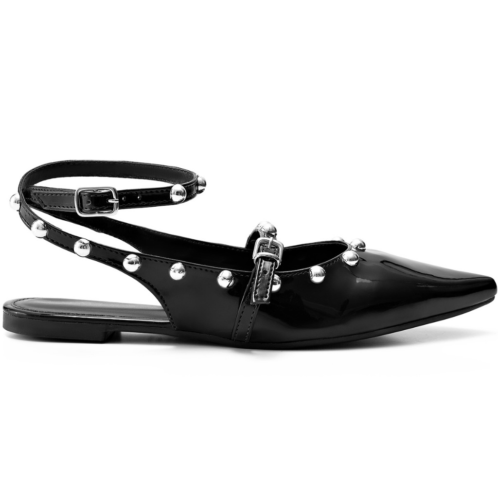 Sapatilha Feminina Lumiss Slingback Bico Fino Tachas Confortável Verniz Preto