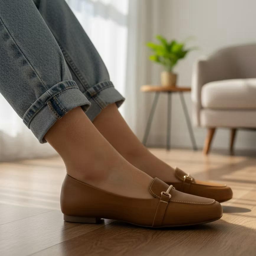 Sapatilha Feminina Mocassim Bico Quadrado Corrente Confort Casual carame