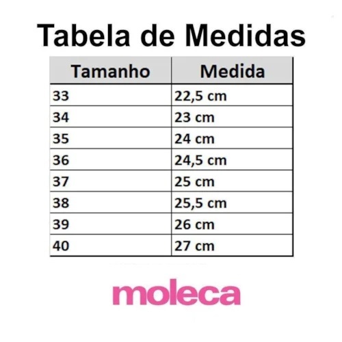 🌸 Sapatilha Moleca Original Tradicional Feminina A Sapatilha Moleca Original Tradicional é perfeita para quem busca conforto, leveza e praticidade no dia a dia. Com design clássico e versátil, ela combina com diversos looks, desde produções casuais até momentos mais descontraídos. Produzida com material de qualidade, oferece ajuste confortável aos pés e solado flexível que proporciona segurança ao caminhar. ✔ Produto 100% original ✔ Super leve e confortável ✔ Fácil de calçar ✔ Ideal para o dia a dia ✔ Solado flexível e resistente ✔ Modelo tradicional que nunca sai de moda. ***TABELA DE MEDIDAS*** Nº 33- 22,5 CM Nº 34- 23 CM Nº 35- 24 CM Nº 36- 24,5 CM Nº 37- 25 CM Nº 38- 25,5 CM Nº 39- 26 CM Nº 40- 27 CM
