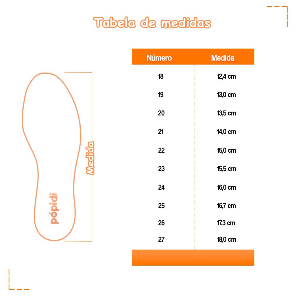 Delicada e feminina a sapatilha é um clássico do universo da menina, além de calçar os pezinhos mais delicados esse modelo é fácil de combinar e deixa qualquer look mais arrumadinho. DETALHES DO PRODUTO Tipo de Produto: Sapatilha Ocasião/Estilo: Casual Material: Sintético Material Interno: Têxtil Material da Sola: TR Nós da Pópidi cuidamos com carinho da relação pré e pós-venda, afinal a satisfação de nossos clientes é muito importante para nós! Atendimento: Segunda à sexta: 07:00 às 18:00 Sábado: 09:00 às 13:00 TABELA DE MEDIDAS 18 --------- 12,4cm 19 --------- 13,0cm 20 --------- 13,5cm 21 --------- 14,0cm 22 --------- 15,0cm 23 --------- 15,5cm 24 --------- 16,0cm 25 --------- 16,7cm 26 --------- 17,3cm 27 --------- 18,0cm COMO MEDIR Coloque o pé em cima de uma folha de papel e risque em volta dele com um lápis ou caneta. Meça o comprimento do topo até a base do contorno e adicione 0,5 cm de folga. LIMPEZA E CONSERVAÇÃO Evite usar substâncias abrasivas como álcool, detergentes ou solventes nos calçados. Nunca os mergulhe na água, os deixe de molho ou lave na máquina. A secagem dos produtos deve ser feita à temperatura ambiente e na sombra, nunca no sol ou em máquinas. SOBRE A EMPRESA Visão Estar em constante expansão e inovação, de uma forma consistente e arrojada. Missão Proporcionar o bem estar dos nossos clientes, satisfazendo-os em um ambiente agradável e cortês com produtos a preços justos e de qualidade. Valores Respeito, Dedicação, Conexão e Atitude. Boas compras e volte sempre!!!