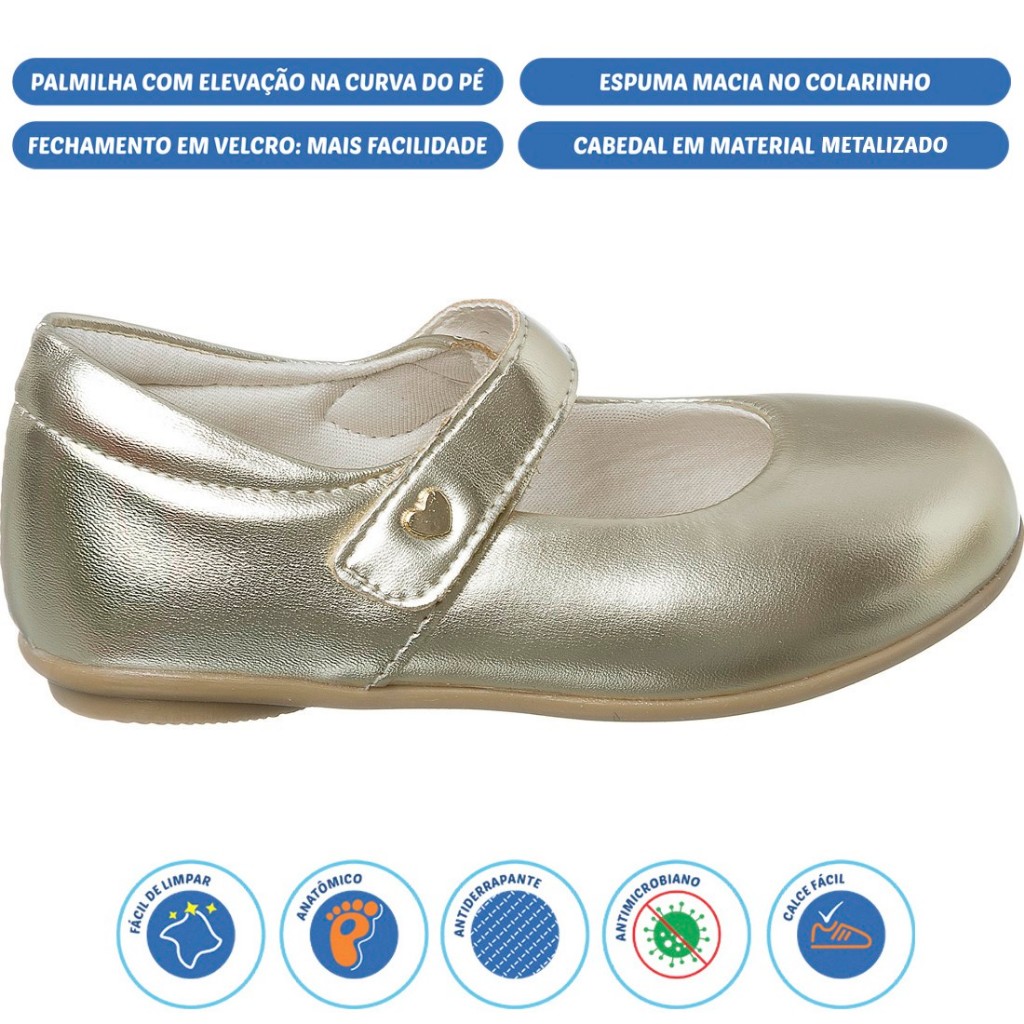 A sapatilha Love é confeccionada em materiais nobres, sendo perfeita para ocasiões especiais e passeios. A espuma no colarinho e a palmilha almofadada permitem que os passinhos das pequenas tenham o máximo de conforto e maciez. Tem ainda um solado antiderrapante que proporciona firmeza e segurança para as meninas aproveitarem de montão. Tabela de Medida: Nº 20 ------------------ 13,5 cm Nº 21 ------------------ 14,2 cm Nº 22 ------------------ 14,8 cm Nº 23 ------------------ 15,7 cm Nº 24 ------------------ 16,3 cm Nº 25 ------------------ 17,2 cm Nº 26 ------------------ 17,8 cm Nº 27 ------------------ 18,3 cm Nº 28 ------------------ 18,6 cm Nº 29 ------------------ 19,3 cm Nº 30 ------------------ 19,9 cm Nº 31 ------------------ 20,5 cm Nº 32 ------------------ 21,2 cm Nº 33 ------------------ 22,2 cm Nº 34 ------------------ 22,9 cm Nº 35 ------------------ 23,6 cm Nº 36 ------------------ 24,3 cm OBS: À cada medida feita, adicione pelo menos meio centímetro para que o pé fique confortável no calçado. Afinal, nenhum sapato fica exatamente do mesmo tamanho dos pés *ATENÇÃO* (encontrasse a tabela na segunda foto do anuncio) DETALHES DO PRODUTO Fechamento: Velcro Material Externo: Sintético Material Interno: Têxtil Material da Palmilha: Sintético Material da Sola: Borracha TR Cor: Dourada Altura do cano: Baixo