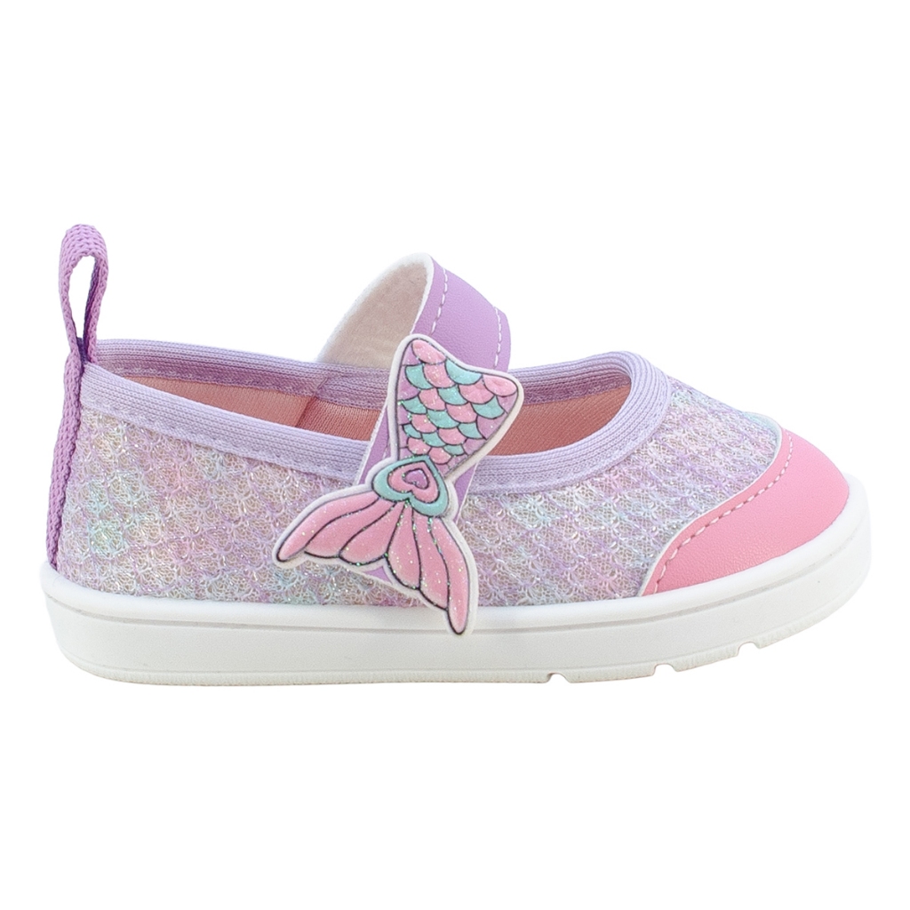 Essa sapatilha traz o encanto do fundo do mar em cada detalhe! Com uma charmosa aplicação de calda de sereia sobre a tira elástica, ela conquista corações com sua combinação de tons suaves de rosa, lilás e verde-água, além do leve brilho no cabedal que remete a escamas cintilantes. Além do visual encantador, o modelo oferece conforto e segurança para as pequenas. Possui solado branco com boa aderência, palmilha acolchoada e estrutura leve, ideal para acompanhar os primeiros passos ou momentos de lazer com estilo e delicadeza. *** ATENÇÃO *** Gentilmente solicitamos, sempre antes da compra, conferir as medidas na tabela abaixo conforme o comprimento do pé da criança. COMO MEDIR: Desenhe o pé da criança em uma folha, risque na posição do começo do calcanhar, e na frente do dedão e utilize a medida entre os dois. TABELA DE MEDIDAS 18---11.6 cm 19---12.4 cm 20---13.0 cm 21---13.7 cm 22---14.5 cm 23---15.2 cm 24---16.0 cm