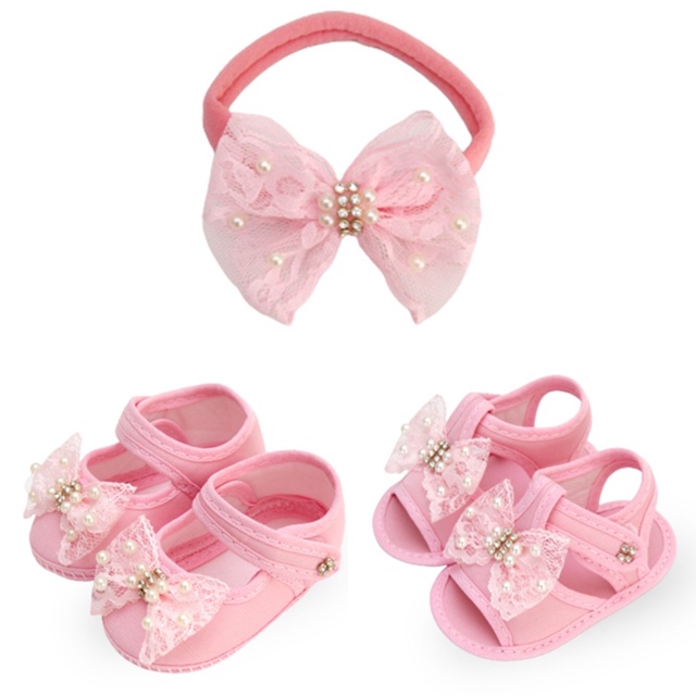 Sapatinho Bebê Kit - Sapatinho, Sandália + Faixa de Cabelo Laços Renda - Recém Nascido