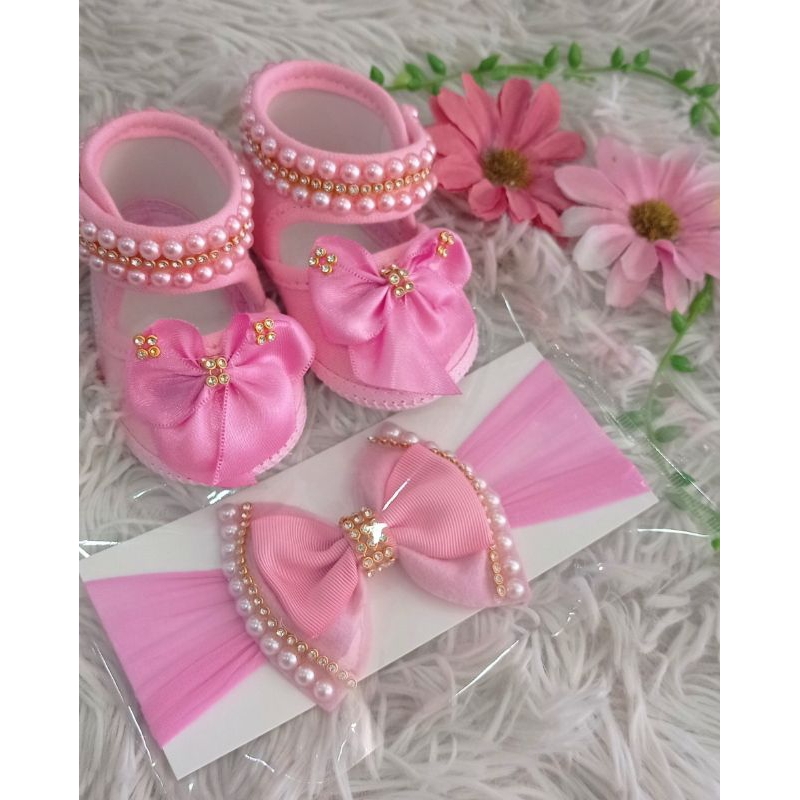 sapatinho princesa customizado com pérolas rosa, branco ou creme+ faixinha de cabelo, sapatinho para batizado