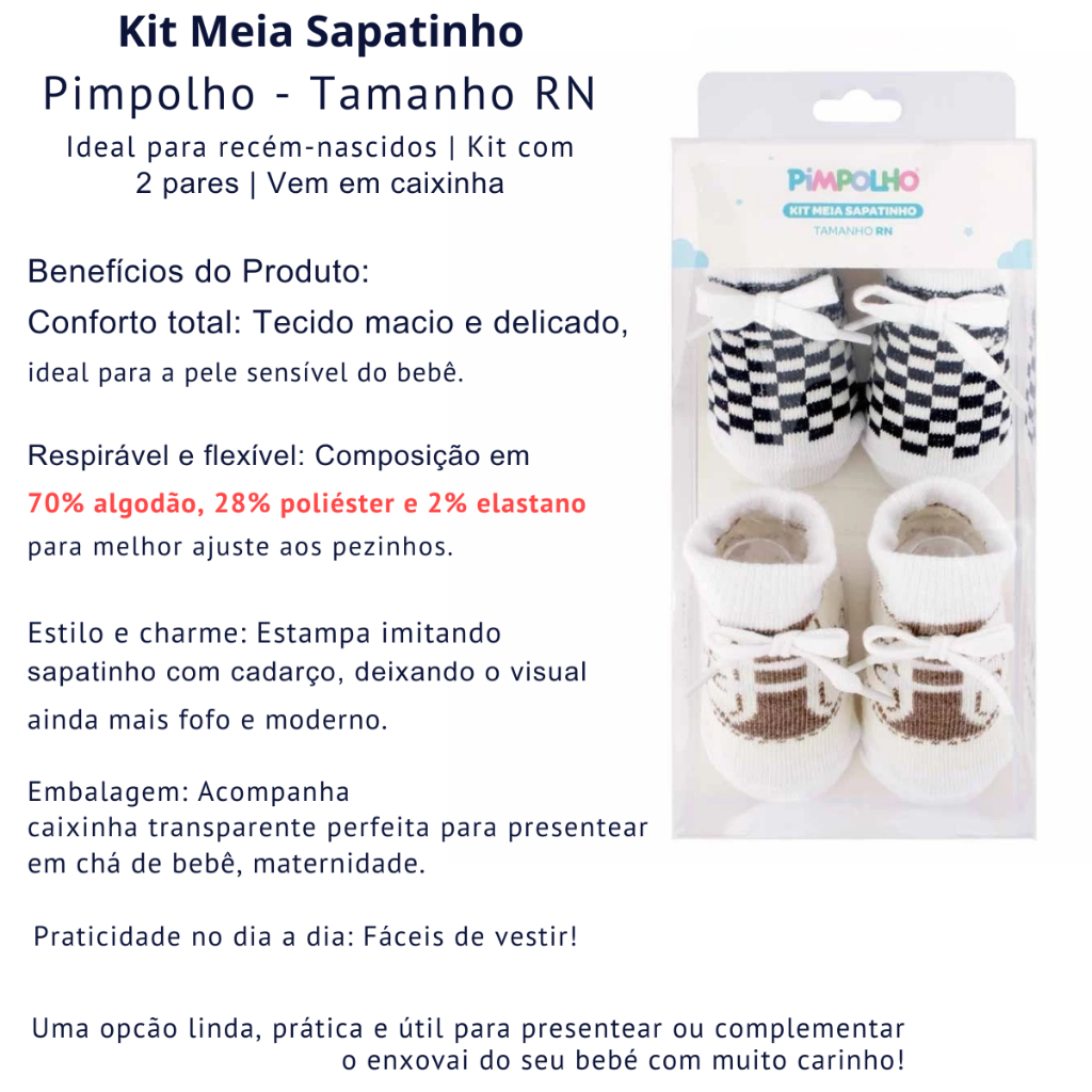 MARCA: PIMPOLHO CONTÉM: MENINO - 2 PARES DE MEIA SAPATINHO VEM NUMA CAIXINHA COMPRIMENTO 19 CM; LARGURA 10CM ; ALTURA 5 CM O Kit Meia Festinha Masculino da Pimpolho possui apliques de cadarços na meia, uma combinação charmosa e divertida. Feito em algodão, oferece o conforto e proteção ideal para os pezinhos dos recém-nascidos. Ótimo substituto para os sapatinhos, ideal para ocasiões de festas ou celebrações, dando um charme todo especial para os pezinhos dos pequenos. Conservação: Lavagem a mão com temperatura máxima de 40ºC; Não alvejar; Não secar em tambor; Secagem em varal; Não passar; Não limpar a seco; Processo normal de limpeza a úmido profissional. Faixa Etária: 00 A 04 Meses Composição: MEIA 70,00% ALGODAO, MEIA 28,00% POLIESTER, MEIA 2,00% ELASTANO