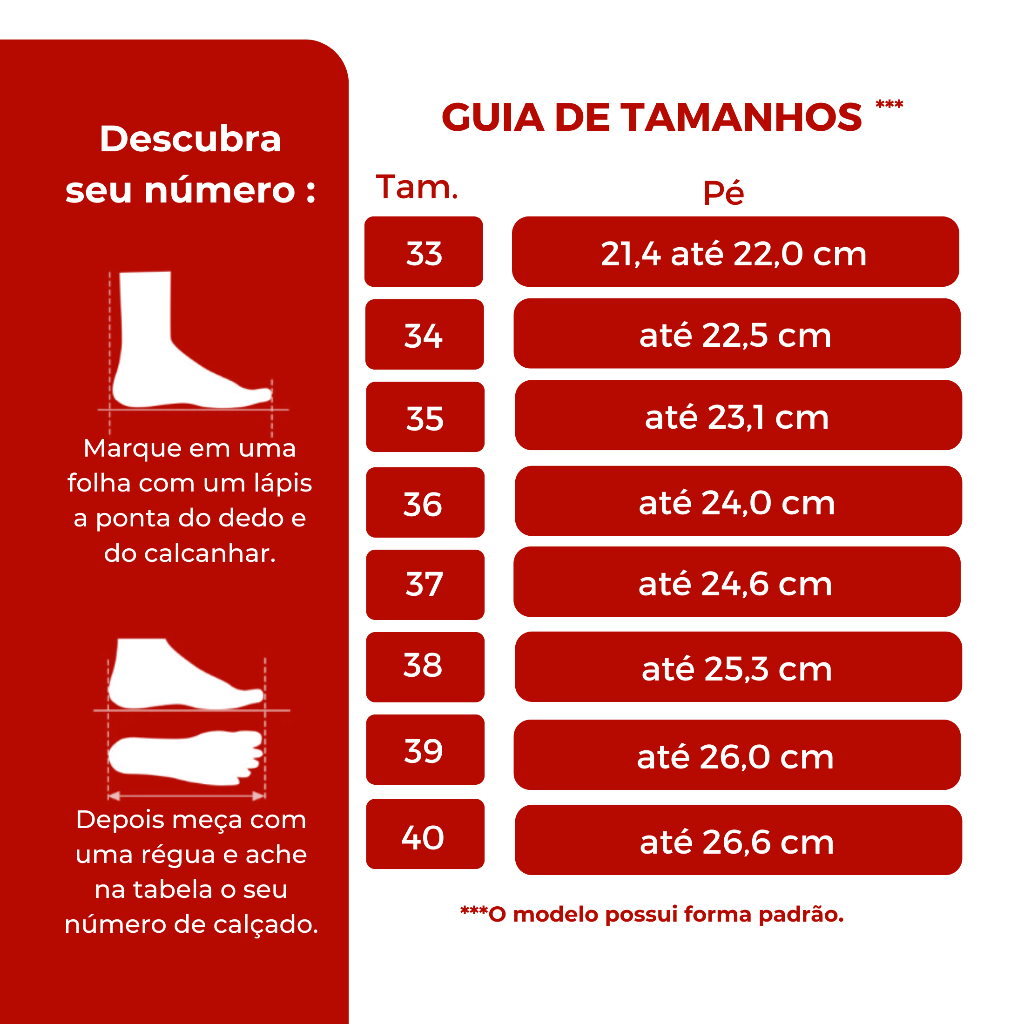CONFIRA A GUIA DE TAMANHOS ANTES DE EFETUAR A COMPRA. *Este modelo possui forma padrão. PRODUTO ORIGINAL DA MOLECA COM NOTA FISCAL! Scarpin feminino versátil. Complete seu visual com charme e leveza! O scarpin de salto baixo com tira e fivela dourada é perfeito para quem busca um visual clássico com um toque de sofisticação. O design com bico arredondado e acabamento suave garante elegância e discrição, ideal para looks formais ou casuais. Confortável e versátil, é o aliado ideal para qualquer ocasião. FICHA TÉCNICA: Altura da sola: aproximadamente 3,0 cm Material: - Preto - Sintético, Têxtil, Napa Turim, Verniz Premium, PVC. - Branco Off - Sintético, Têxtil, Napa Turim, Verniz Premium, PVC. ATENÇÃO: - Escolha a cor e numeração no momento da compra, pois não é possível alterar a compra depois de finalizada. Os Tamanhos a seguir correspondem ao tamanho médio do pé feminino brasileiro em relação a cada numeração. No entanto, é importante considerar que a forma, o molde e a estrutura do pé podem influenciar na escolha ideal. Para escolher a numeração, tire a medida do pé (da ponta do dedo ao final do calcanhar): - Tamanho 33: Tamanho do pé: 21,4 até 22,0 cm (Dedão ao calcanhar) - Tamanho 34: Tamanho do pé: até 22,5 cm (Dedão ao calcanhar) - Tamanho 35: Tamanho do pé: até 23,1 cm (Dedão ao calcanhar) - Tamanho 36: Tamanho do pé: até 24,0 cm (Dedão ao calcanhar) - Tamanho 37: Tamanho do pé: até 24,6 cm (Dedão ao calcanhar) - Tamanho 38: Tamanho do pé: até 25,3 cm (Dedão ao calcanhar) - Tamanho 39: Tamanho do pé: até 26,0 cm (Dedão ao calcanhar) - Tamanho 40: Tamanho do pé: até 26,6 cm (Dedão ao calcanhar) Aproveite e leve agora esse clássico repaginado! A Loja oferece qualidade de atendimento, com as melhores marcas e produtos selecionados para você. Nosso foco é proporcionar uma experiência de compra prática, segura e com muito estilo.