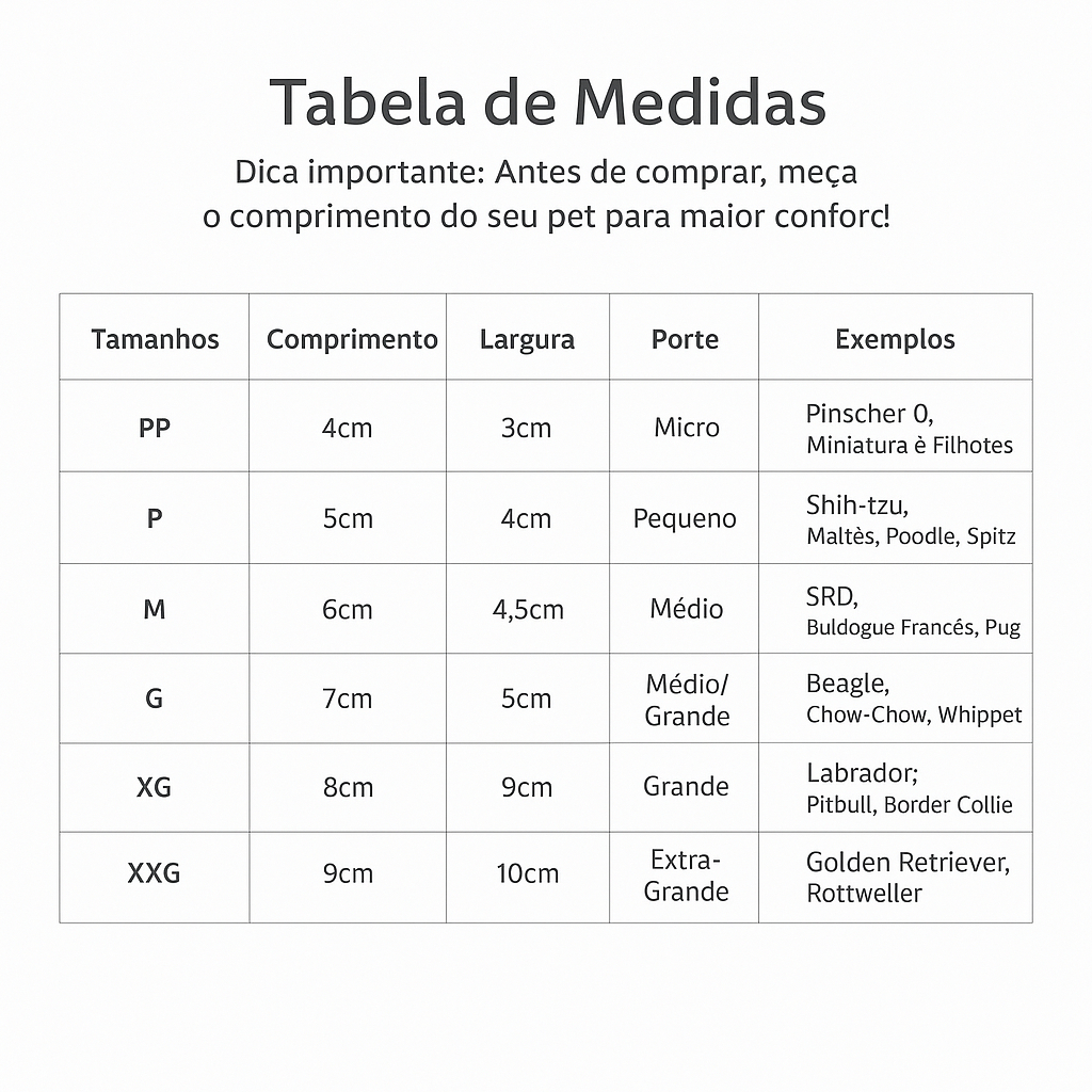 🐾 Sapatinhos Botas para Cães – Conforto e Proteção para o Seu Pet! Leve mais conforto e segurança para os passeios do seu melhor amigo! Os sapatinhos foram desenvolvidos para proteger as patinhas em qualquer ocasião: seja contra o calor do asfalto, a umidade da chuva ou até para manter a casa sempre limpa. ✅ Benefícios: Mantém as patinhas limpas, secas e protegidas. Antiderrapante e impermeável, ideal para dias chuvosos. Anti-térmico: protege contra o calor do asfalto. Velcro ajustável que garante fixação firme e segura. Uso interno e externo, perfeito para qualquer ambiente. 📏 Tabela de Tamanhos: M: 5x4,5cm G: 6x5cm 👉 Dica: Meça a patinha do seu pet e compare com a tabela para escolher o tamanho correto. 💡 Perguntas Frequentes: O material é resistente? Sim, produzido com tecido impermeável, antiderrapante e costura reforçada. ✨ Garanta já os sapatinhos ideais para deixar seu pet confortável, protegido e cheio de estilo!
