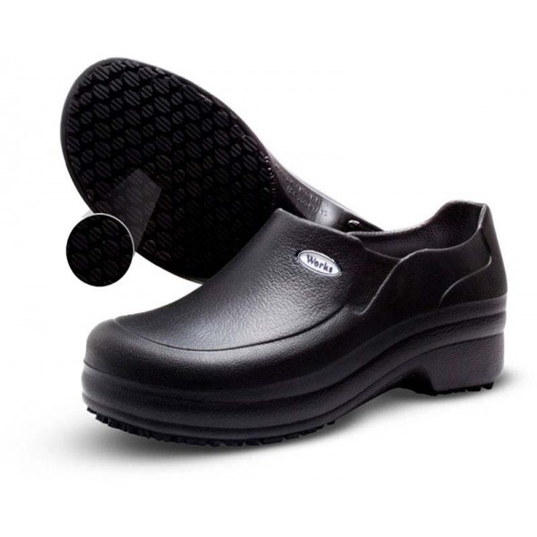 Calçado ocupacional de uso profissional tipo sapato (OB), fechado na parte do calcanhar e na parte superior (NR32), confeccionado em EVA nas cores preta e branca, solado de borracha antiderrapante, resistente ao escorregamento em piso cerâmico com solução de detergente e em piso de aço com solução de glicerol (SRC), resistente ao óleo combustível (FO) e à absorção de energia na região do salto (E). Proteção dos pés do usuário contra riscos de natureza leve, contra agentes abrasivos e escoriantes e contra umidade proveniente de operações com uso de água.