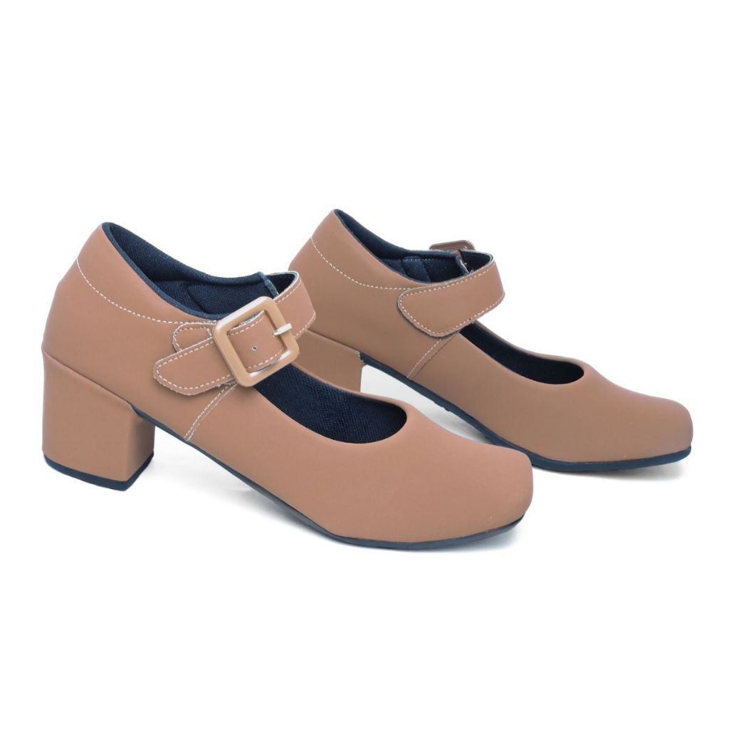 Sapato Feminino Bico quadrado Salto Grosso Caramelo Marrom Solado Preto Ajuste Fivela