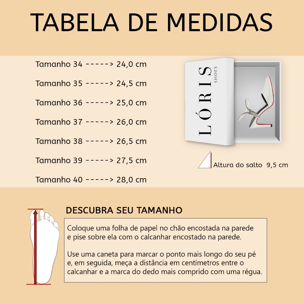 Sapato Feminino Scarpin Salto Alto Traseiro Aberto com Brilho Confortavel 4001 Experimente o charme do nosso scarpin. A moda é combinar o modelo de sapato mais tradicional junto com o brilho que é uma das maiores tendências da atualidade. Esse modelo com sola resistente garante segurança e praticidade durante o uso. O ajuste aos pés proporciona conforto e estabilidade, enquanto o acabamento em pedraria de strass adiciona um toque sofisticado. Ideal para qualquer ocasião. ••••••••••• TABELA DE MEDIDAS PALMILHA ••••••••••• Modelo de Bico Fino, pegar a numeração habitual ou um número a mais. A medida abaixo é do bico até o calcanhar: Tamanho 34 -----> 24,0 cm Tamanho 35 -----> 24,5 cm Tamanho 36 -----> 25,0 cm Tamanho 37 -----> 26,0 cm Tamanho 38 -----> 26,5 cm Tamanho 39 -----> 27,5 cm Tamanho 40 -----> 28,0 cm ••••••••••• ESPECIFICAÇÕES DO PRODUTO ••••••••••• • Disponível nas Cores: Preto, Off White e Nude • Material Externo: Sintético Verniz e Manta de Strass Pedraria • Material Interno: Forro Sintético • Palmilha: com espuma confortável e aplique da logo. • Solado: TR emborrachado antiderrapante, confortável, não faz barulho, não escorrega. • Altura do Solado: 9,5 cm • Fabricada com materiais de alta qualidade, esta sapatilha garante conforto durante todo o dia com elegância e estilo. • Direto da Fábrica. • Produto Original e Pronta Entrega. • Cada par é entregue em sua caixa individual, cuidadosamente embalado em um envelope plástico resistente. • Consulte nossa tabela de medidas abaixo antes da compra, para garantir o ajuste perfeito. •••••••••••••••••••••••••••••••••••••••••••••••••••••••• ❤️❤️ Bem-vindo à Lóris Shoes Oficial ❤️❤️ • Somos comprometidos com a excelência, nossos calçados são confeccionados com materiais premium de qualidade e acabamento primoroso. • Valorizamos a satisfação do cliente e buscamos sempre oferecer praticidade, envio rápido, qualidade e preços justos. • Assim como cada par de nossos sapatos é único, cada cliente é especial, e é por isso que buscamos oferecer um atendimento personalizado que você merece. • Queremos proporcionar a você a melhor experiência de compra. Entre no mundo da elegância e conforto com a Lóris Shoes Oficial. Compre agora o seu par perfeito e dê passos de confiança em grande estilo. ••••••••••••••••••••••••••••••••••••••••••••••••••••••••