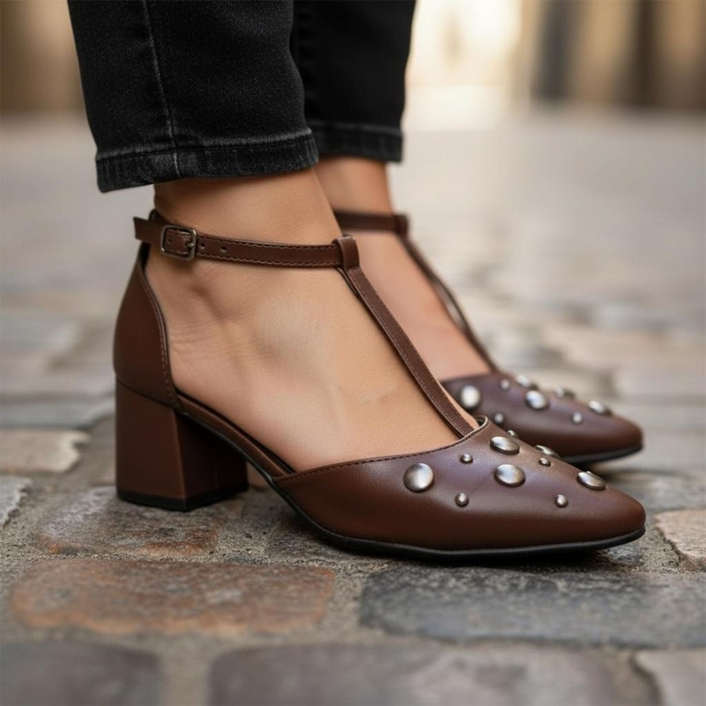 Sapato Feminino Scarpin Social Confortável Elegante Salto Bloco 6Cm Enfeite Tachas Tendencia 2026