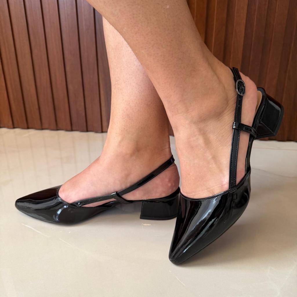 Sapato Feminino Slingback Scarpin Social Tiras Fivela Bico Fino Verniz Salto Baixo Bloco Confortável