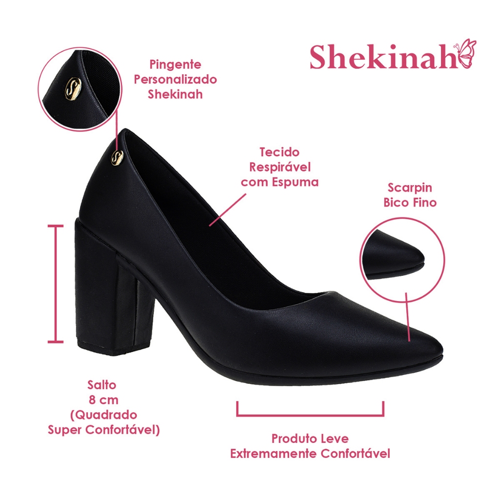 O Sapato Scarpin da Shekinah Calçados é perfeito para mulheres adultas que buscam elegância e conforto. Com material sintético e verniz de alta qualidade, este scarpin feminino possui um salto quadrado grosso e confortável, ideal para festas e ocasiões especiais. Seu design moderno e luxuoso, com bico fino e sola de PVC, garante um visual sofisticado e atual. Perfeito para qualquer ocasial , este sapato é uma verdadeira obra de arte, leve e macio, proporcionando conforto e estilo. Atemporal e elegante, é o sapato ideal para mulheres que buscam um calçado de luxo e moda para arrasar em qualquer evento. **** INFORMAÇÕES TÉCNICAS *** + Cor – Cor Original da Foto do Produto. + Material – Sintético + Peso - 700 g + Solado – Antiderrapante + Palmilha – Conforto com aplique da logo. + Numeração: será enviada pelo critério de escolha + Caixa embalagem: Cada par será enviado em sua caixa individual. + Frete: Conforme regras da Plataforma. *** Tabela de medidas *** Numeração em Centímetros 34 ------------- 23,0cm 35 ------------- 23,5cm 36 ------------- 24,0cm 37 ------------- 25,0cm 38 ------------- 25,5cm 39 ------------- 26,0cm 40 ------------- 27,0cm ALTURA DO SOLADO : 8 cm