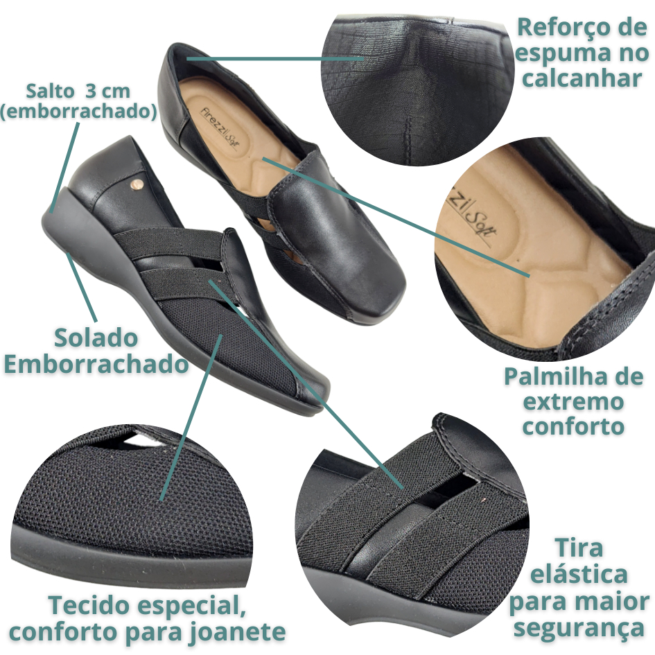 SAPATO SUPER CONFORTO FIREZZI, MODA E BEM-ESTAR NO DIA A DIA: Sapato Super Conforto Firezzi, o calçado perfeito para quem busca conforto e estilo. Com seu design moderno e elegante, ele é ideal para mulheres que desejam se sentir bem e andar com segurança. CARACTERÍSTICAS DO PRODUTO MATERIAL: Confeccionado em napa sintética de alta qualidade, possui elásticos e tecido especial nas laterais que trazem conforto a quem sofre com joanetes. DESIGN: O Sapato Super Conforto Firezzi possui um design moderno e elegante, possui linhas suaves e detalhes que valorizam a beleza dos pés. O destaque fica por conta do tecido na lateral, que oferece suporte extra para quem tem problemas com joanetes. Os elásticos na parte superior facilitam o calce e proporcionam um ajuste perfeito. CONFORTO: A palmilha macia e o solado anabela emborrachado com 4 cm de altura distribuem o peso do corpo de forma uniforme, aliviando a pressão nos pés e proporcionando uma sensação de leveza ao caminhar. O reforço de espuma no calcanhar evita incômodos com atritos na pele. Mas o grande diferencial desse sapato é o tecido nas laterais para maior conforto de quem sofre com joanetes, proporcionando conforto mesmo após várias horas de uso. INFORMAÇÕES TÉCNICAS Material: Napa Sintética, tecido especial para joanetes e elásticos. Material forro: Cacharel (têxtil) Palmilha: Alto conforto, produzida com espuma de alta densidade Peso: 240g cada pé aproximadamente Salto: Anabela, 4cm Solado: TR (emborrachado) Embalagem: Caixinha de sapato. Numeração: FORMA NORMAL. Recomendamos a compra do número que você usa normalmente. MEDIDA DO PÉ 33 - 23,0 cm 34 - 23,7 cm 35 - 24,2 cm 36 - 24,7 cm 37 - 25,2 cm 38 - 25,7 cm 39 - 26,2 cm 40 - 26,7 cm 41 - 27,2 cm O PRODUTO POSSUI FORMA NORMAL, RECOMENDAMOS A COMPRA DA NUMERAÇÃO QUE VOCÊ UTILIZA NORMALMENTE. DÚVIDAS FREQUENTES: Por que o sapato é tão confortável? O Sapato Super Conforto Firezzi é confortável por diversos fatores projetados para promover bem-estar. Seu solado macio e acolchoado amortece o impacto dos passos, tornando a caminhada mais suave e confortável. O salto anabela emborrachado oferece estabilidade e segurança, ajudando no equilíbrio ao caminhar. Os elásticos nas laterais combinados com o tecido especial para joanetes facilitam o calce e proporcionam um ajuste perfeito ao formato do pé, evitando desconfortos. Esse sapato traria conforto aos meus joanetes? Sim. Este sapato é projetado para oferecer conforto e suporte para pessoas que sofrem com joanetes. O tecido especial é macio e elástico, permitindo que o sapato se adapte ao formato do pé e alivie a pressão sobre o joanete. Qual o prazo de envio do Sapato Super Conforto? O Sapato Super Conforto, assim como todos os nossos produtos estão disponíveis a pronta entrega. O envio é realizado no mesmo dia nas compras aprovadas até às 12h.